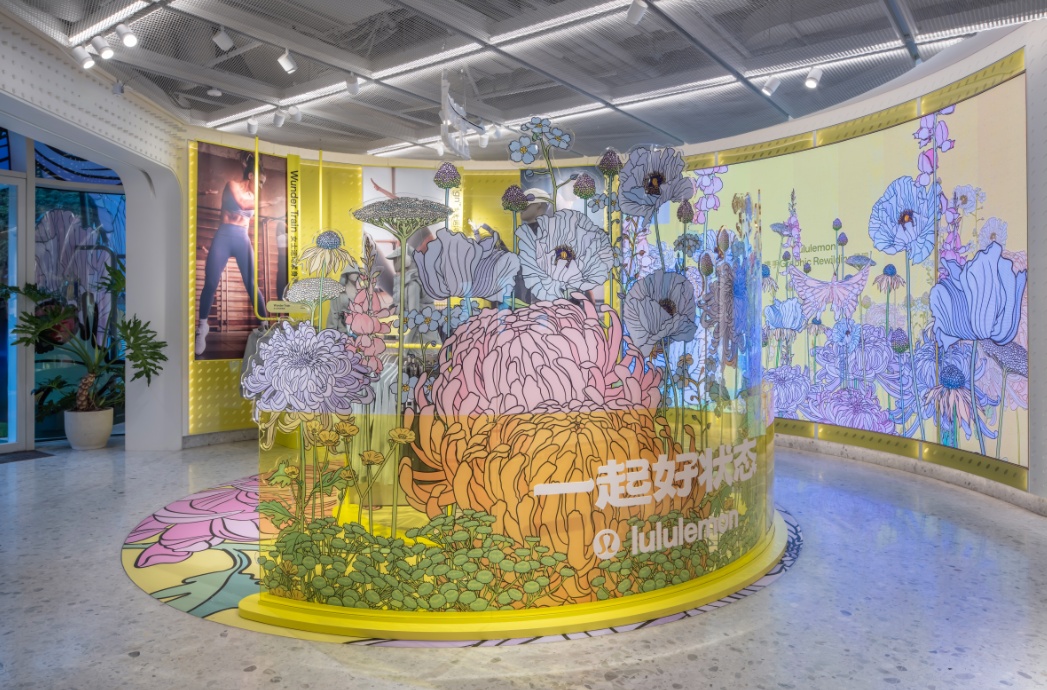 在lululemon上海静安嘉里中心门店呈现的“好状态心展花园”,凭借其鲜明的色彩和丰富的寓意(不同的花卉分别代表瑜伽、跑步、训练和恢复等),该艺术作品旨在邀请生活在都市中的人们动一动,让身心松动,感受自己内心的花园。