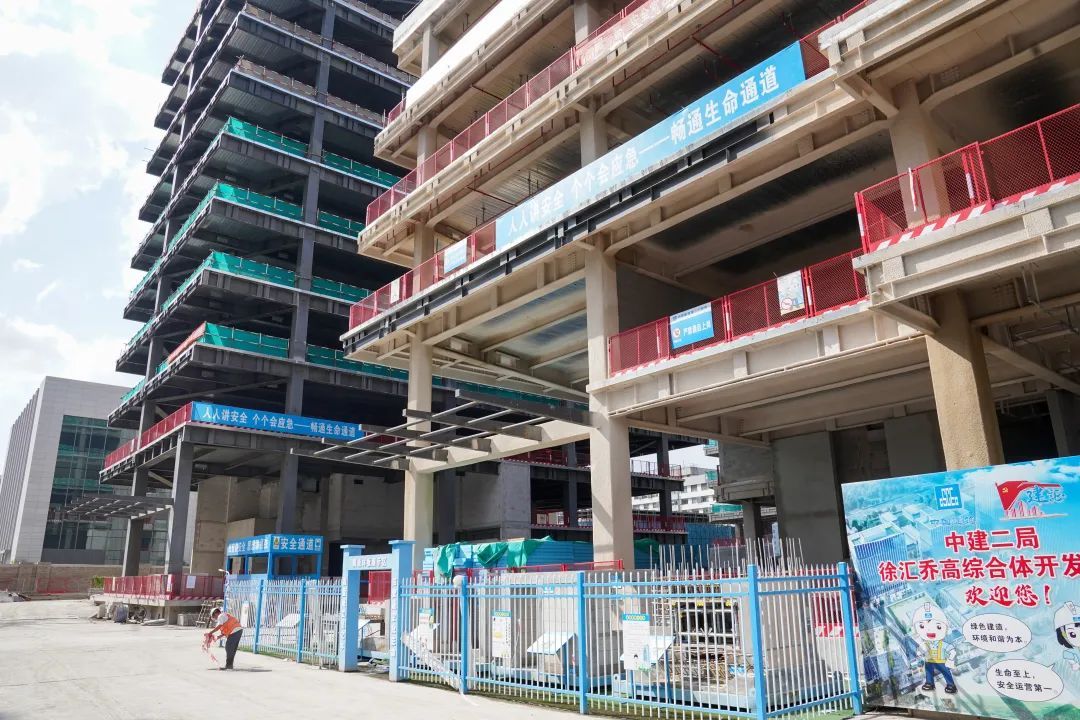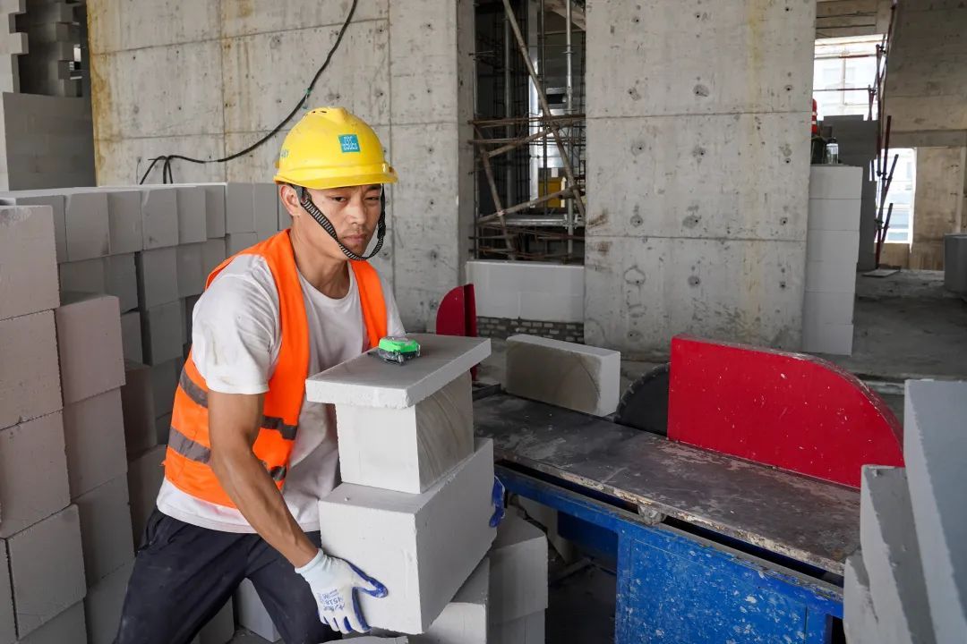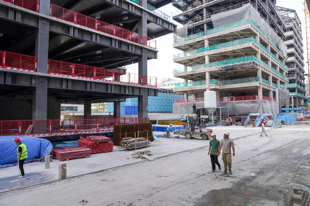 项目施工现场,塔吊高耸入云,工人们头戴安全帽、身系安全绳,穿梭在塔吊与作业面间。尽管前段时间的台风给施工进度带来了一定的影响,但工人们并未因此气馁,反而更加争分夺秒地抢抓这难得的黄金时期。