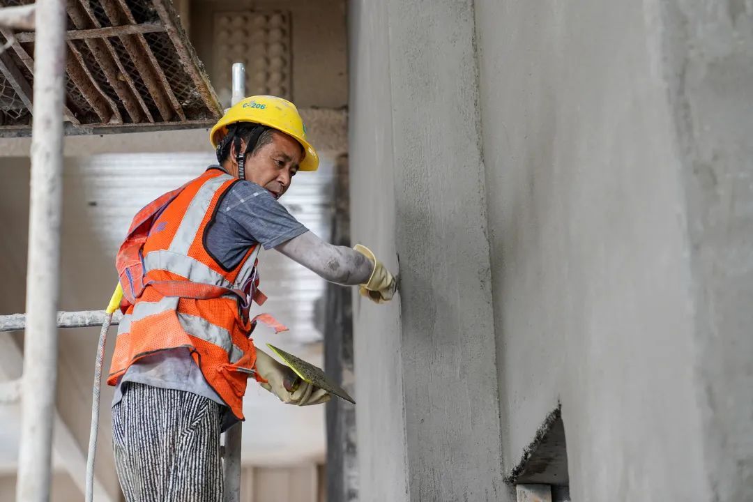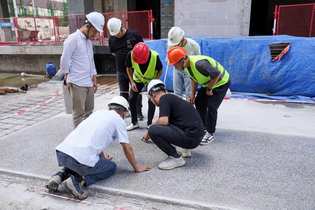 在另一面墙体前,抹灰工们正忙着完成最后一道工序——拍浆、挂网、抹灰。旁边还有工程师们围在地面样板前,讨论着地下室地面的施工方案。