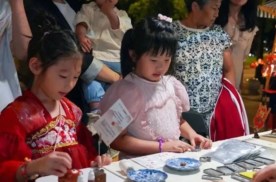 彩绘花钿摊位吸引了不少小朋友的目光,非遗文化传承人飘飘正用笔勾勒花钿的雏形,灵动的妆造与古朴的国风服饰相得益彰。“这样的非遗活动办在家门口很有新意,晚饭后出来逛一圈,非常惬意。”市民王女士说。