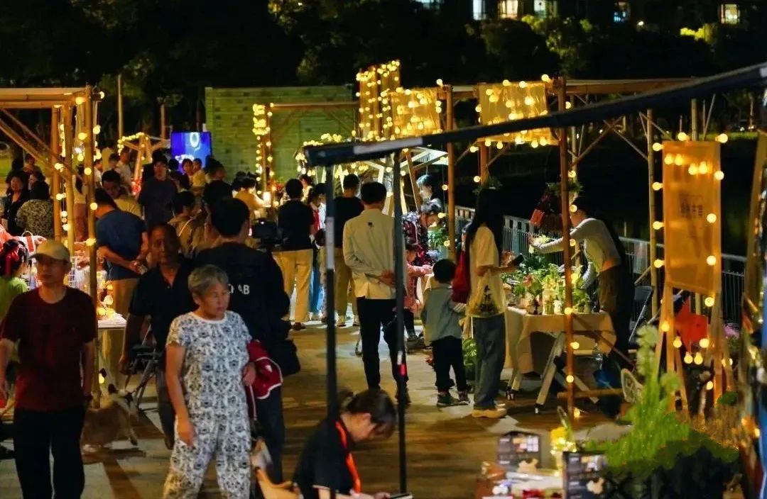 华灯初上,左邻右舍扎堆进市集,赏非遗、寻佳品,拍照打卡、集章换礼,一派热闹的景象。手工串珠摊位前,来自社区共建单位“宋明&花间”的主理人,正在教授串接技巧,带市民感受手工的乐趣;传统茶道摊位前清香四溢,社区公益学堂的小艳老师将茶文化的博大精深娓娓道来。