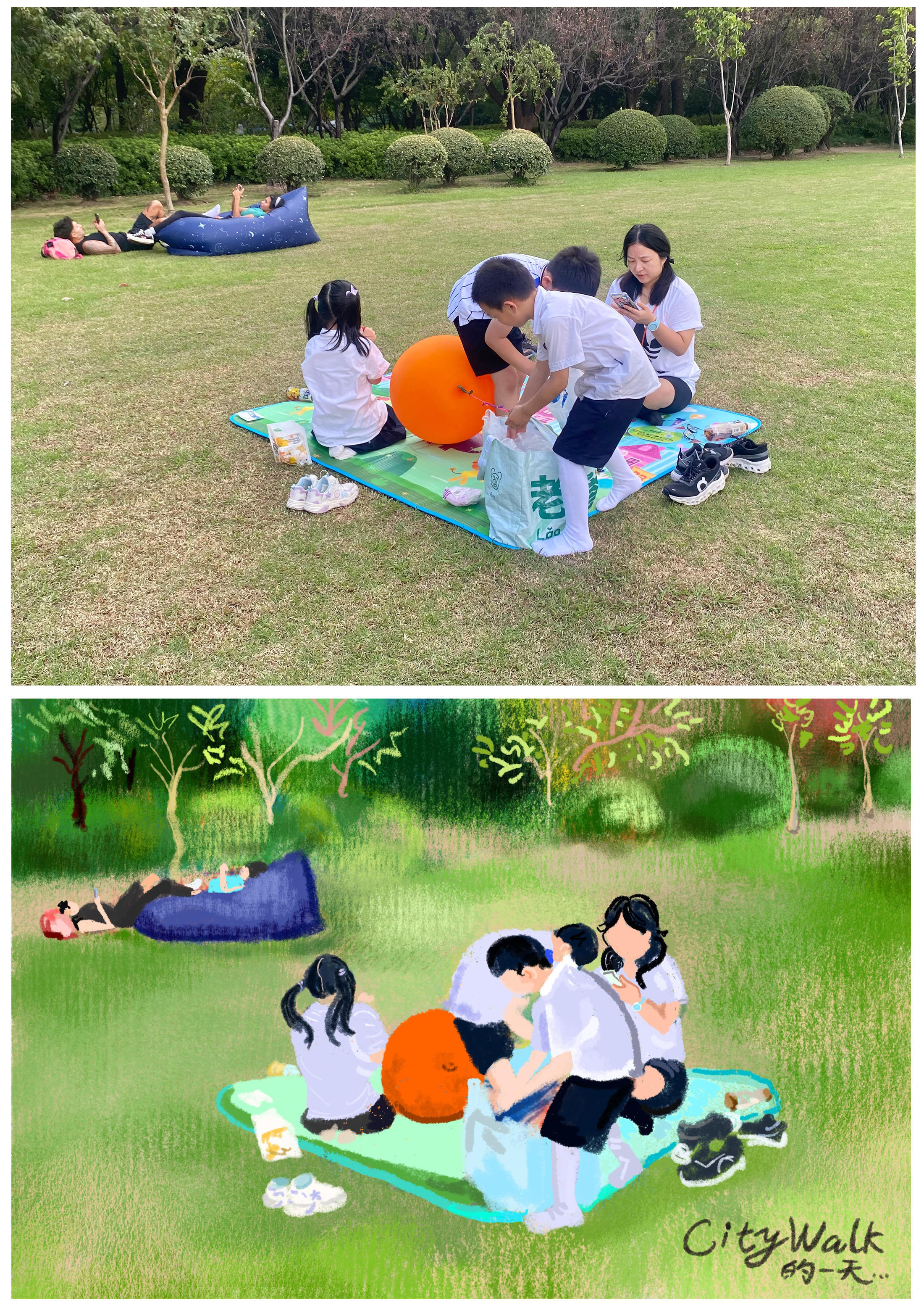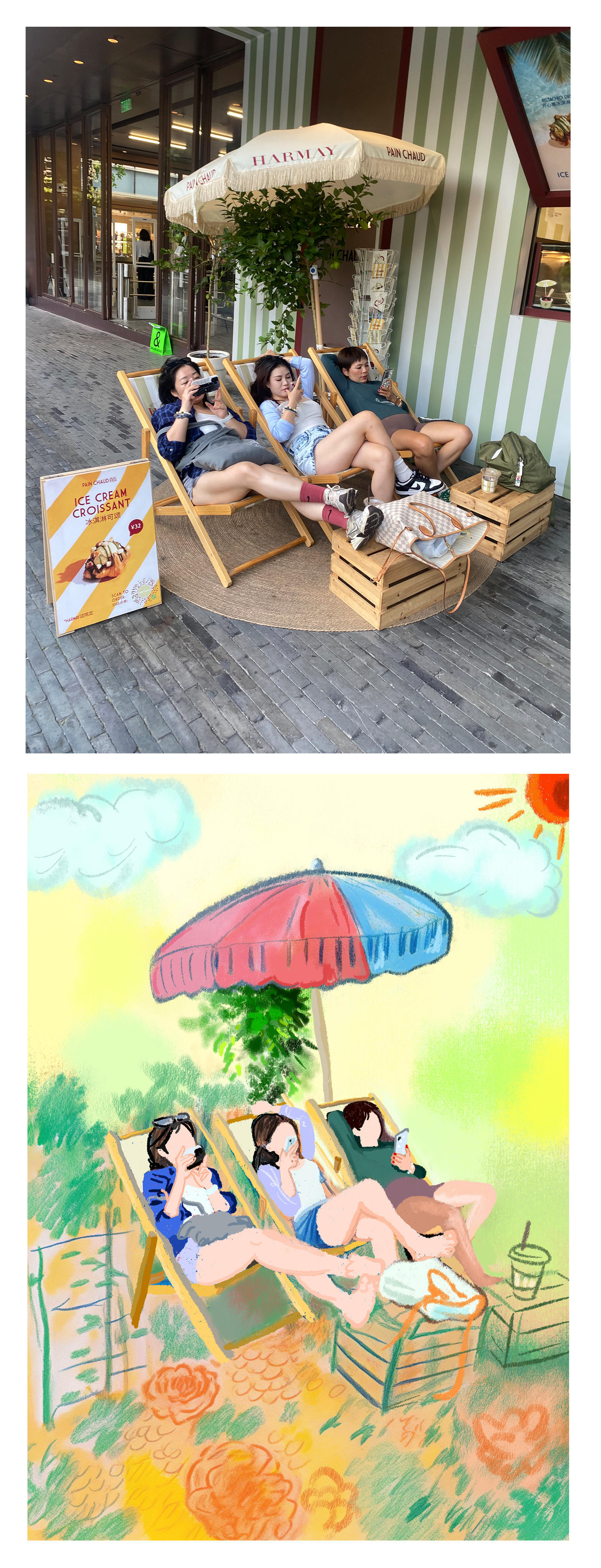 新天地附近的饮料店前,三个坐在折叠椅上的时髦姐妹花把惬意的氛围瞬间切换到了沙滩度假模式。