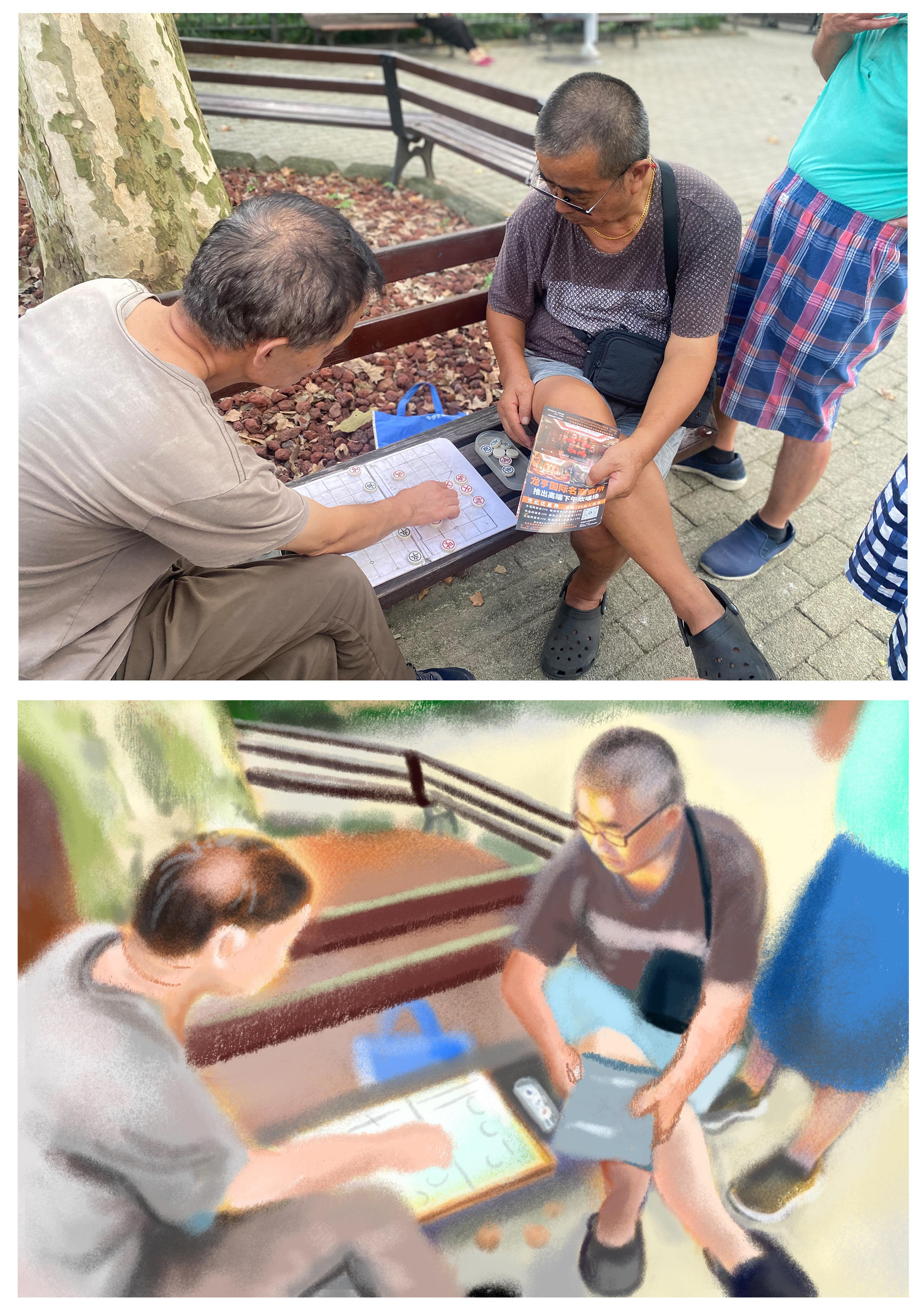 梧桐树下的长椅上,两个爷叔已经在棋局上杀出一番“天昏地暗”来。局中人聚精会神,围观的人津津有味。