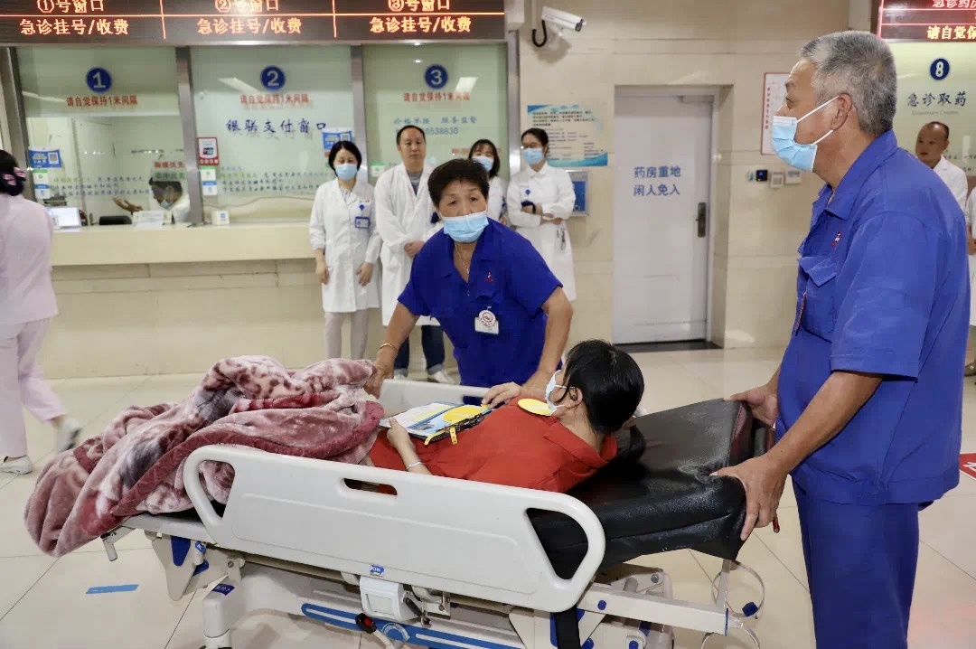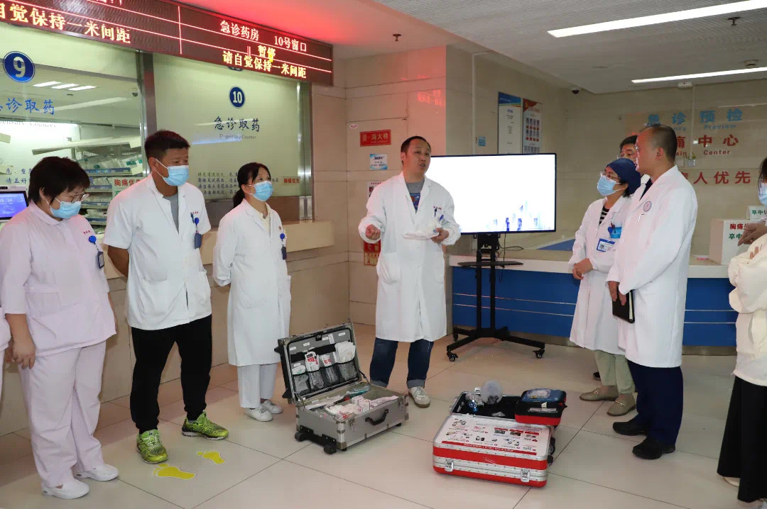 当天,现场还模拟了批量伤员到院后,分诊护士接车、询问、观察生命体征,依据病情评估危重程度对患者进行标识和分区,医疗组有序进行轻症处置、外伤包扎、危重症救治。