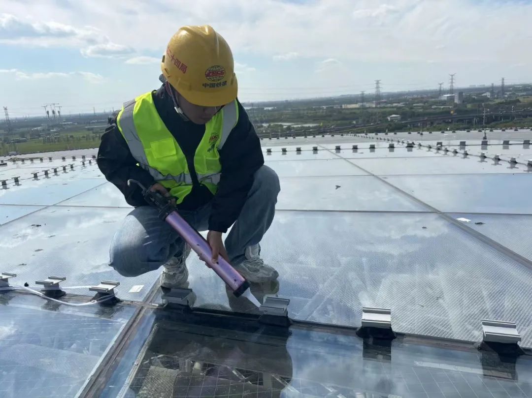 10月3日上午9时,上海松江站多重圆环造型的屋面上,中铁二十四局施工人员邹俊杰正在进行打胶作业,打胶是屋面施工中的关键环节,它能有效防止水渗漏,从而延长建筑物的使用寿命。这名年仅23岁的云南小伙,为了赶在10月底前完成屋面施工收尾工作,毅然决定国庆期间加班加点。他笑着说:“家里人也支持我,觉得年轻人多奋斗挺好的。”