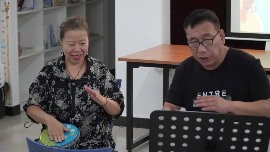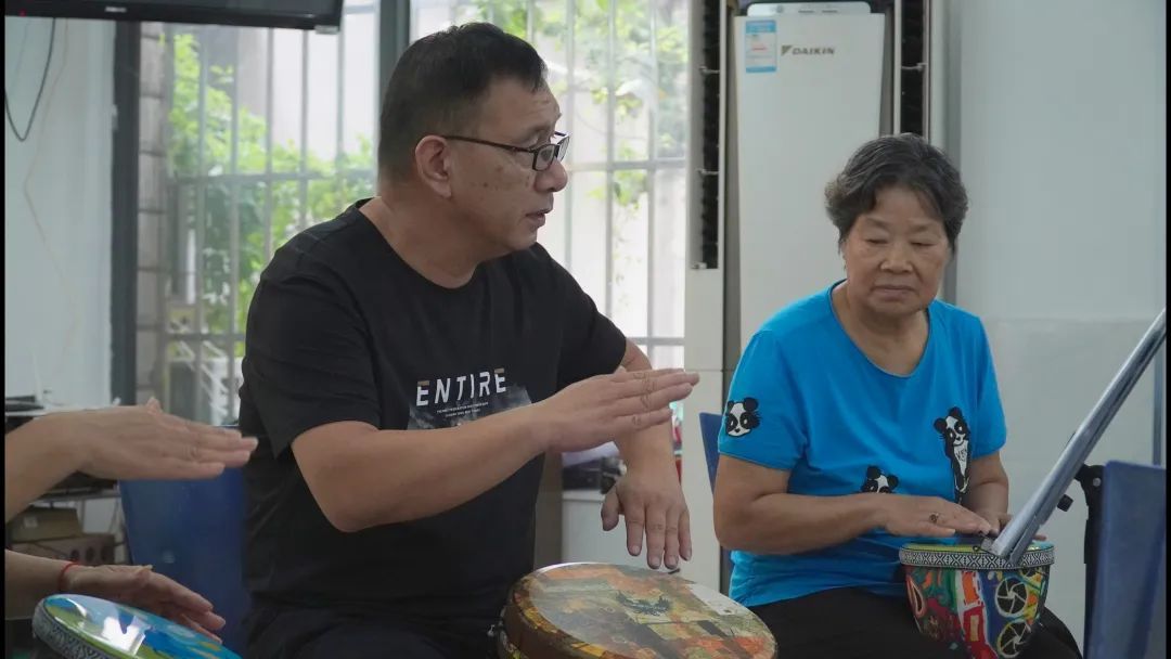 居民徐阿姨存在认知障碍轻度风险,此次已是她连续第二次参加活动。以前,徐阿姨从未接触过非洲鼓,活动中她感到兴奋又新奇。“打鼓不难,好上手。有时候左右手要交替得比较快,我容易记不住,但老师会很耐心地手把手带着学。”徐阿姨说,“现在我和很多同学都熟悉起来了,来这里上课就像小朋友一起上音乐课,很开心的!”