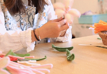 取一根粉色的扭扭棒,将其对折、剪开,取头部的3厘米左右,进行弯折旋转。