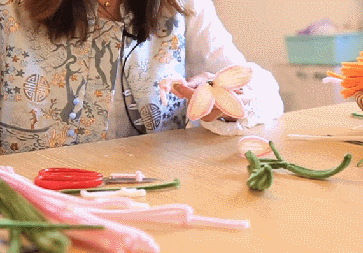 取出花艺胶带,分别把叶片缠绕在花杆上。