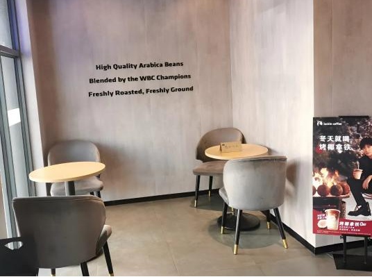 这家店似乎专为工作日忙碌的上班族打造,周末并不营业。它位于初心驿光华党群服务中心内,整体风格与光华世界相协调,以原木风为主调。到达时,已有不少周边的上班族在此休息、交谈,店内的座椅是皮质的,还设有整墙的书架,一旁的电视机还在播放着节目。