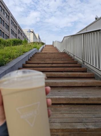 Manner的门店左侧是坡形设计,可以沿着斜坡来到咖啡厅的正上方,一览周围高处的风景。所幸这边阳光不晒,又有着些微风,我拿着咖啡,站在高处,塞上耳机,小声唱起了歌。你别说,《起风了》和天台的适配度简直是100%。