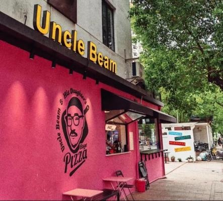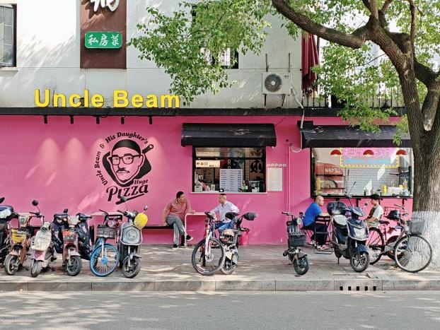 路过“巨头”咖啡后,一路向东,远远就可以看到一家极具冲击感的粉色披萨店,超高饱和度,上面印有黑色的头像Logo,这颜值路过绝对都会停下来。之前一直没碰到过老板,这次竟然碰上了,如此粉嫩的一家店,老板竟然是位戴着围裙的潮男,反差感十足。