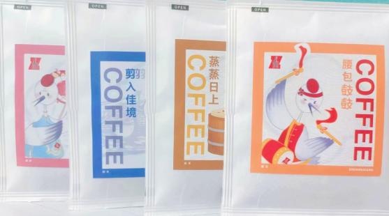 这家的咖啡也可以是说最具地方特色的一家了,咖啡外包装盒子上印的是鹤鸣颛溪内容的非遗剪纸,里面四包不同式样的挂耳咖啡,每一包上面分别呈现了颛桥四艺,即“腰包鼓鼓”的腰鼓、“剪入佳境”的剪纸、“蒸蒸日上”的桶蒸糕、“转走焦虑”的转伞,文化意味满满。