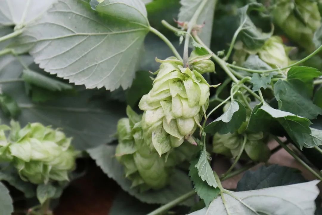 啤酒花,单从名字就能知晓它是酿造啤酒不可或缺的材料之一。啤酒花是桑科(也有资料称为大麻科)葎草属的多年生攀援草本植物,它的茎、枝和叶柄上密生绒毛和倒钩刺,叶片呈卵形或宽卵形,边缘有粗锯齿。啤酒花的雄花排列为圆锥花序,花被片与雄蕊均为5枚,果穗球果状,瘦果扁平。其花期主要集中在秋季,喜欢干燥冷凉的气候,耐旱且耐盐碱,但对光照要求较高,适宜生长在富含有机质的酸性土壤中。