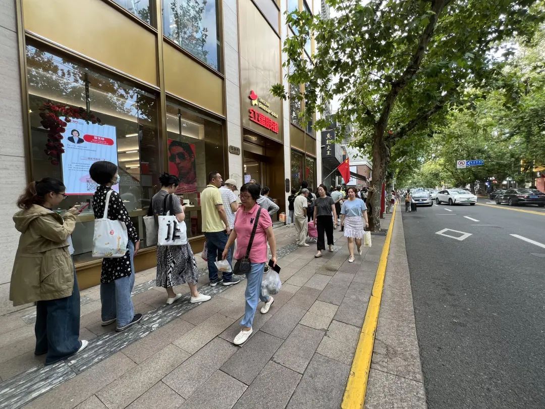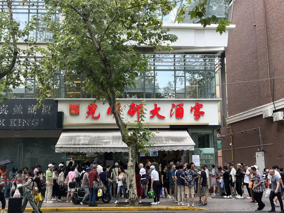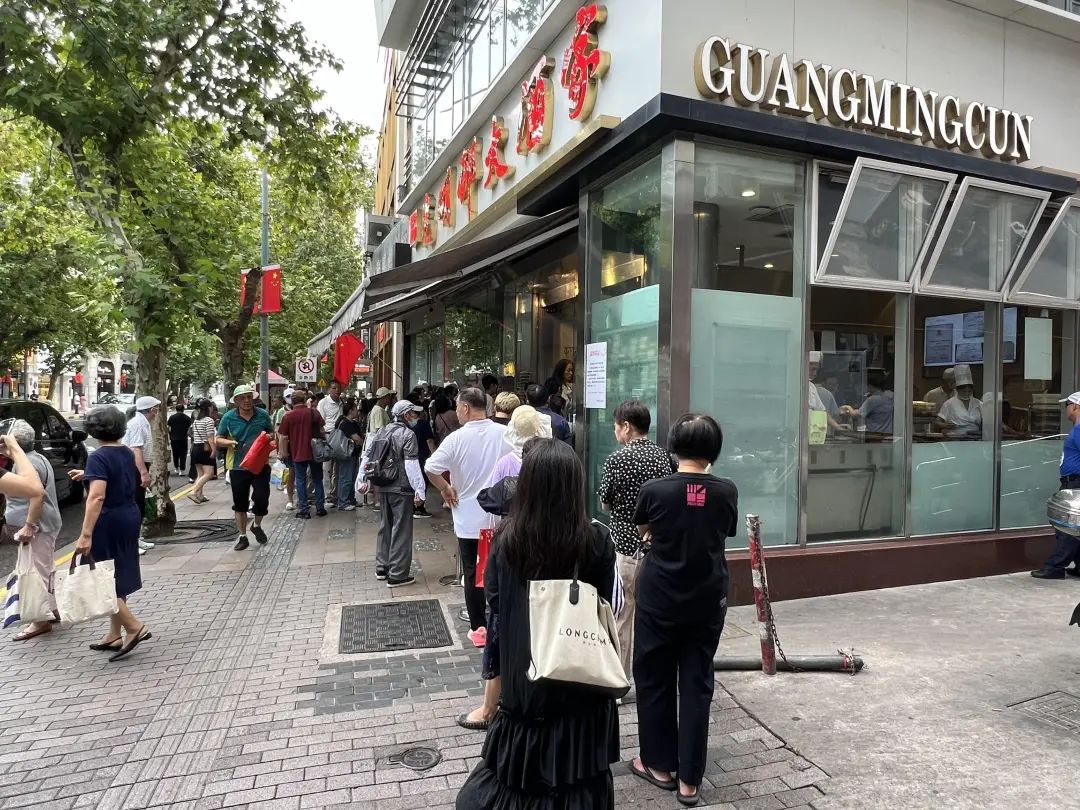 国庆长假,淮海路上常年排队的光明邨大酒家照例排起了队,只是没想到排队买熟食的队伍一直排到了20米外的眼镜店,记者注意到,招牌的酱鸭、牛肉、熏鱼是最受欢迎的;不远处的鲜肉月饼档口依然在发挥“余热”,一位正在排队的食客告诉记者,中秋节期间排队太久,故错峰来买,没想到还是要排队;除了店门口的两条长队,店内也是一片繁忙景象,等待落座的既有本地食客,也有拖着行李箱前来“打卡”的游客。