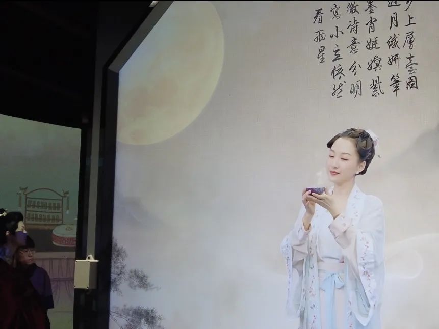 展览内部分为花区、香区、琴区与月区,分别对应宋人雅事中的插花、焚香、挂画以及古人中秋拜月的传统习俗。来到现场,观众不仅可以收获步入古画的新奇体验,还可以沉浸式地体验宋人雅事与中华传统习俗,通过科技手段与那个久远的年代产生独属于自己的连接点。