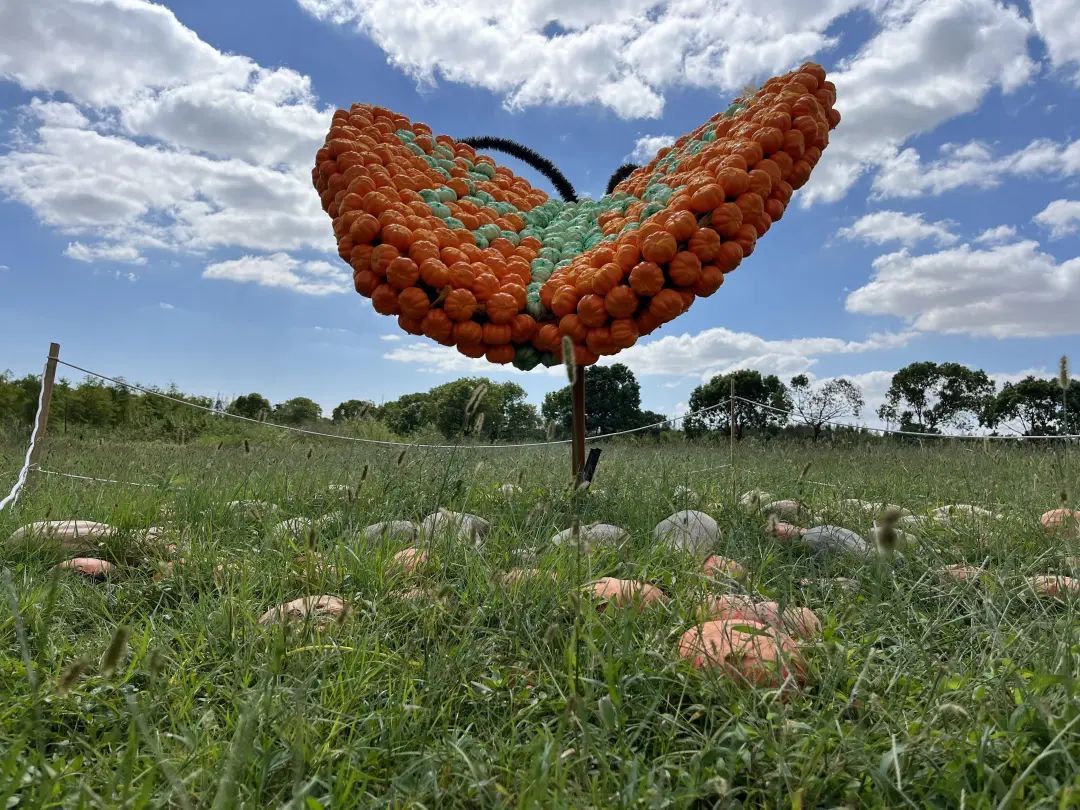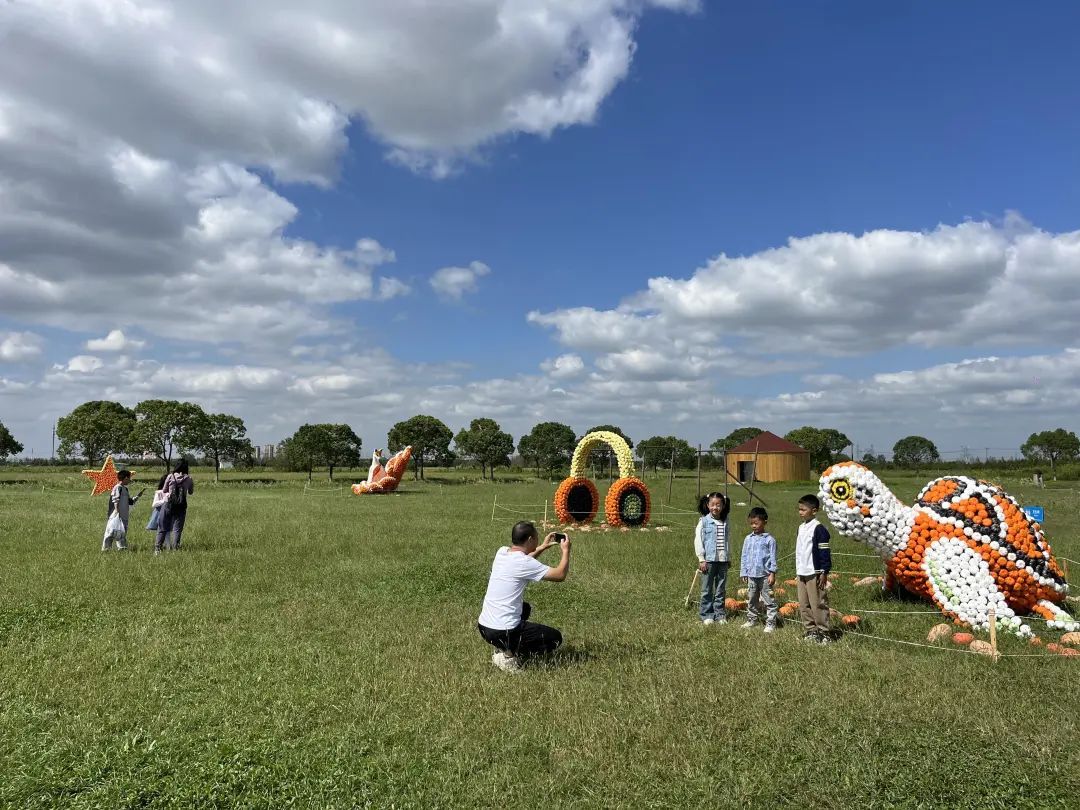 沿着都市菜园主干道进入园区,很快就能看到大草坪上的南瓜童话王国。各种形状奇特的真假南瓜,组合出极具想象力和创造力的15组艺术创作。不仅有高达3米的小恐龙、霸气十足的九尾狐、逼真的巨型耳机等小朋友熟悉的卡通动漫、AI机器人、海洋动物,更有最近出圈的黑神话悟空的形象展示,供孩子们自由打卡拍照。“我看到了很多南瓜,有黄色的、橘色的,黄橘相间的,有长胖的,有长瘦的。”现场以亲子家庭为主,小朋友自由奔跑玩耍,不少家长表示,园区空间很大,孩子们不仅可以亲近大自然,还能学到不少农业知识,整体感觉很不错。