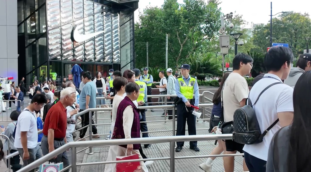 “请注意台阶,请勿停留,请继续前行。”从地铁2号线人民广场站出发,穿越下沉式广场及西藏中路地道,便抵达了南京东路步行街的起点。长假期间,每日午后,该区域便迎来客流高峰。今日下午1时,记者在西藏中路地道口观察到,人流如织,络绎不绝。为避免地道进出口处的人流对冲,黄浦分局南京东路派出所民警在地道通往步行街的道路上设置了近20米的延伸围挡,明确划分了进出地道的楼梯,实现两进两出的有序流动,有效消除了安全隐患。同时,每个出入口均有警力值守,不断提醒市民与游客注意安全,避免驻足拍照或看手机。