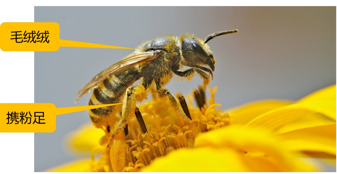 蜜蜂的食物是花蜜和花粉。为了便于采集花粉,蜜蜂的身体上长满了细密的绒毛,同时它们的后足胫节基部较宽扁,边缘有长毛,形成花粉篮,跗节甚大,分五节,第一节膨大,内侧具有数排横列的硬毛,可梳集黏着在体毛上的花粉,称之为花粉刷。当工蜂在花朵中取食花蜜时,花粉粘附在身体上,随后工蜂利用花粉刷将全身细毛上沾满的花粉粒刷下,混以唾液和采得的一部分花蜜,粘合成小团块,装入花粉篮中,随后带回巢内,再进行加工。