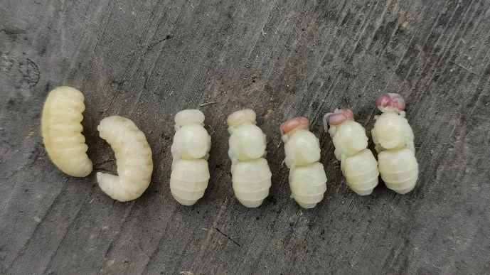 一只工蜂的成长要经历21天,分为卵——幼虫——蛹——成虫(蜜蜂)四个阶段,成虫后工蜂的寿命从6周到数月不等,夏天寿命短,冬天寿命长。