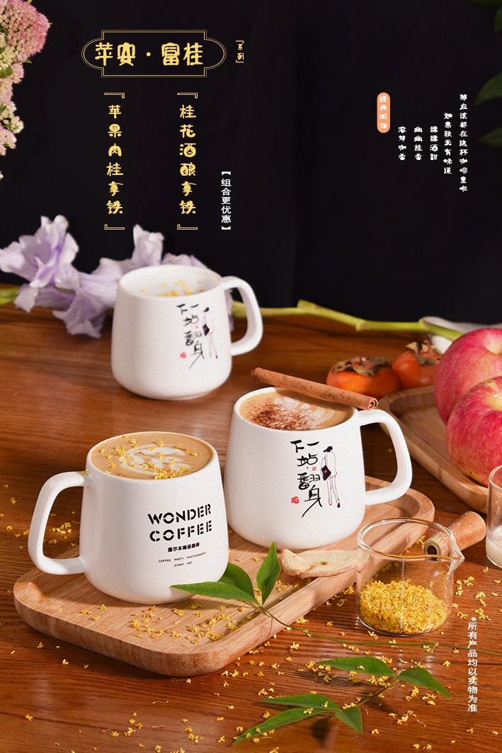 【苹安·富贵双杯套餐】:苹果肉桂酒酿拿铁+桂花酒酿拿铁,苹果肉桂风味和浓郁桂香与精酿米酒和奶咖的碰撞,花香、酒香、咖啡香精确融合,两杯咖啡可以体味一年四季的变化。