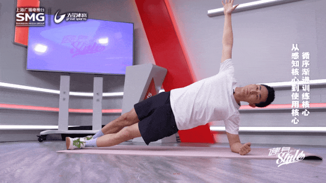 动作要点:侧卧在地面上,手肘支撑,下面的膝关节呈90度,用大腿外侧支撑在垫子上,上面的腿伸直用脚内侧支撑,撑起自己躯干保持一条直线,保持稳定呼吸20秒,完成一侧后稍作休息再做另外一边。每边20秒,2-3组。
