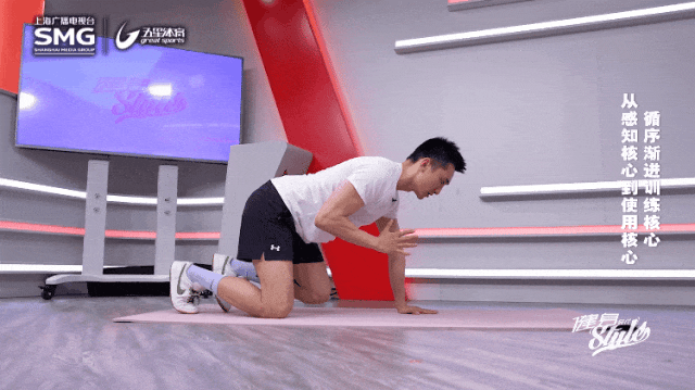 动作要点:双手双膝支撑在地面上,保证膝关节和髋关节呈90度,脊柱在中立位上即可。头要向上向前延伸,膝盖微微离开地面,双手交替摸对侧肩膀。交替10次,2-3组。