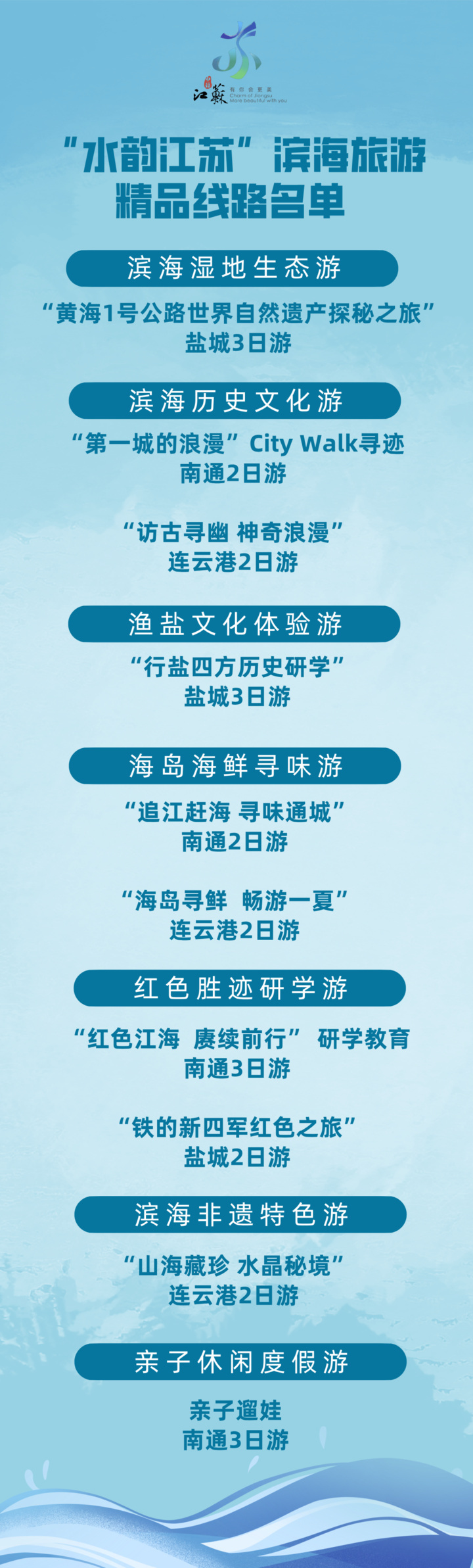 据悉,10条线路深度挖掘江苏滨海三市地域、人文、风光特色,包括滨海湿地生态游、滨海历史文化游、渔盐文化体验游、海岛海鲜寻味游、红色胜迹研学游、滨海非遗特色游、亲子休闲度假游7个大类。从万类霜天竞自由的湿地生态,到才得波涛变成雪的渔盐文化,从天风海雨力开山的红色胜迹,到传奇人间两相宜的历史体验,从文脉乡愁古为新的滨海非遗,到黄发垂髫共欢乐的亲子休闲,海纳百川、万象多彩,供游客选择。