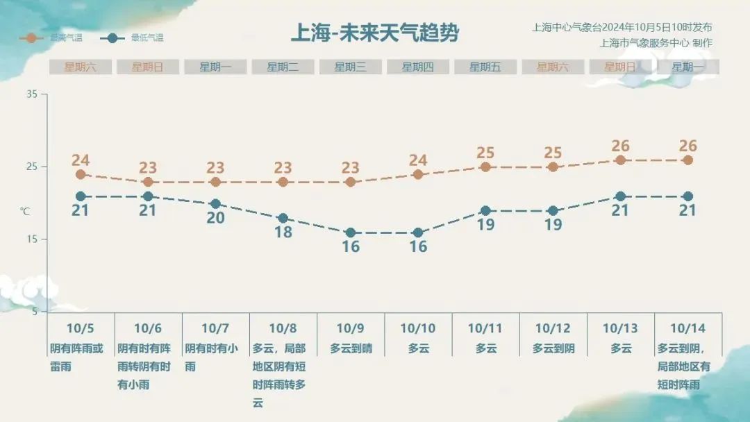 今天(10月5日)中午以前申城天气为阴到多云有时有阵雨,下午雨势加强,转为阴有阵雨或雷雨,全天气温在21~24℃之间。据预计,本轮明显降水将会维持到明天中午,累积雨量为大到暴雨,局部地区可达大暴雨,预计明天下午雨势减弱。今明风雨来袭,长假最后一天天气如何?目前来看,7日本市依旧维持弱降水天气,降水期间全天温差不大,届时气温将维持在20~24℃之间。