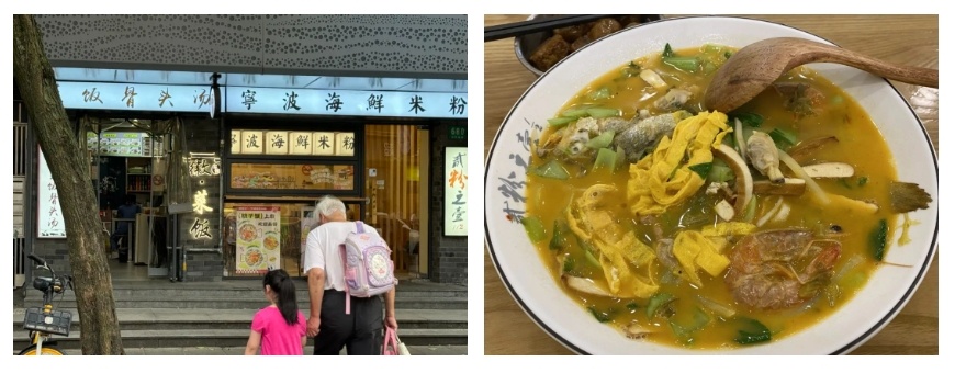 沿着马路向前,法华镇路680号的“贰粉之壹”宁波海鲜米粉,是另一家备受街坊们喜爱的宝藏小店。小店主打宁波风味的各式海鲜汤粉、炒粉,还有家常海鲜小炒,镬气十足。店面虽不大,装修却干净而有格调。木色的屏风和桌椅,显得十分温馨。海鲜粉的汤底鲜咸中带着微微的甜,配有细细的米粉以及雪菜、香菇、蛋皮、青菜、土豆丝等各种小料。喝一口汤,再嗦一口粉,让人欲罢不能。