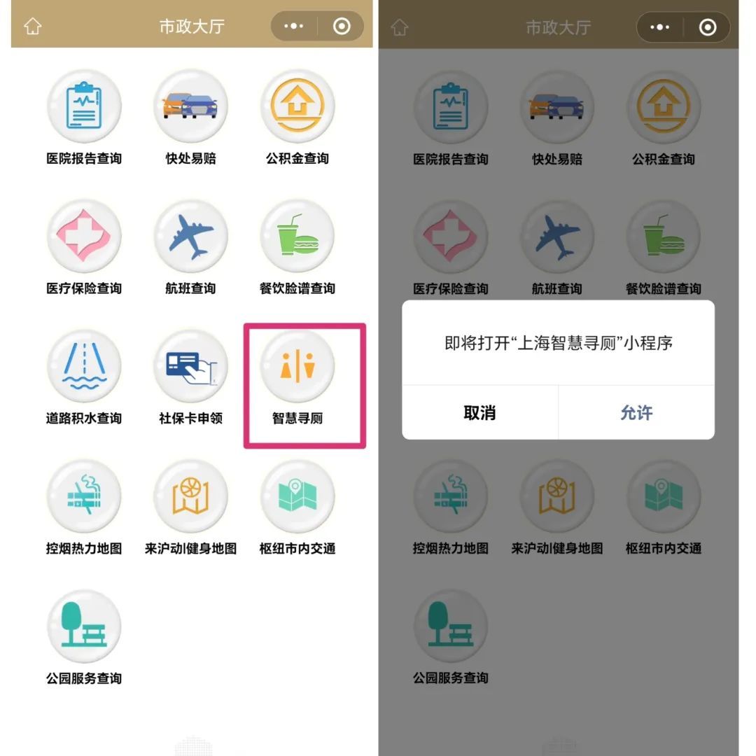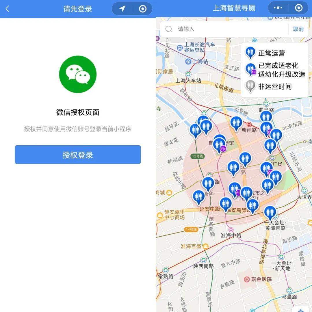 下滑页面找到“智慧寻厕”,看到弹出的即将打开“上海智慧寻厕”小程序权限请求后点击“允许”,然后会弹到微信授权页面,点击“授权登录”即可,系统会自动根据所在位置给出查询到的公厕信息,包括“正常运营”“已完成适老化适幼化升级改造”等公厕。