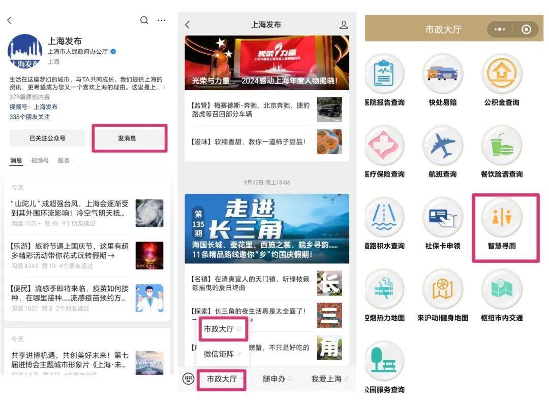 大家也可在关注“上海发布”后点击“发消息”进入消息页面,然后点击左下角的“市政大厅”功能栏,弹出功能框后继续选择“市政大厅”进入市政大厅服务页面,然后下滑找到“智慧寻厕”服务,后续操作流程与上述操作攻略一致。