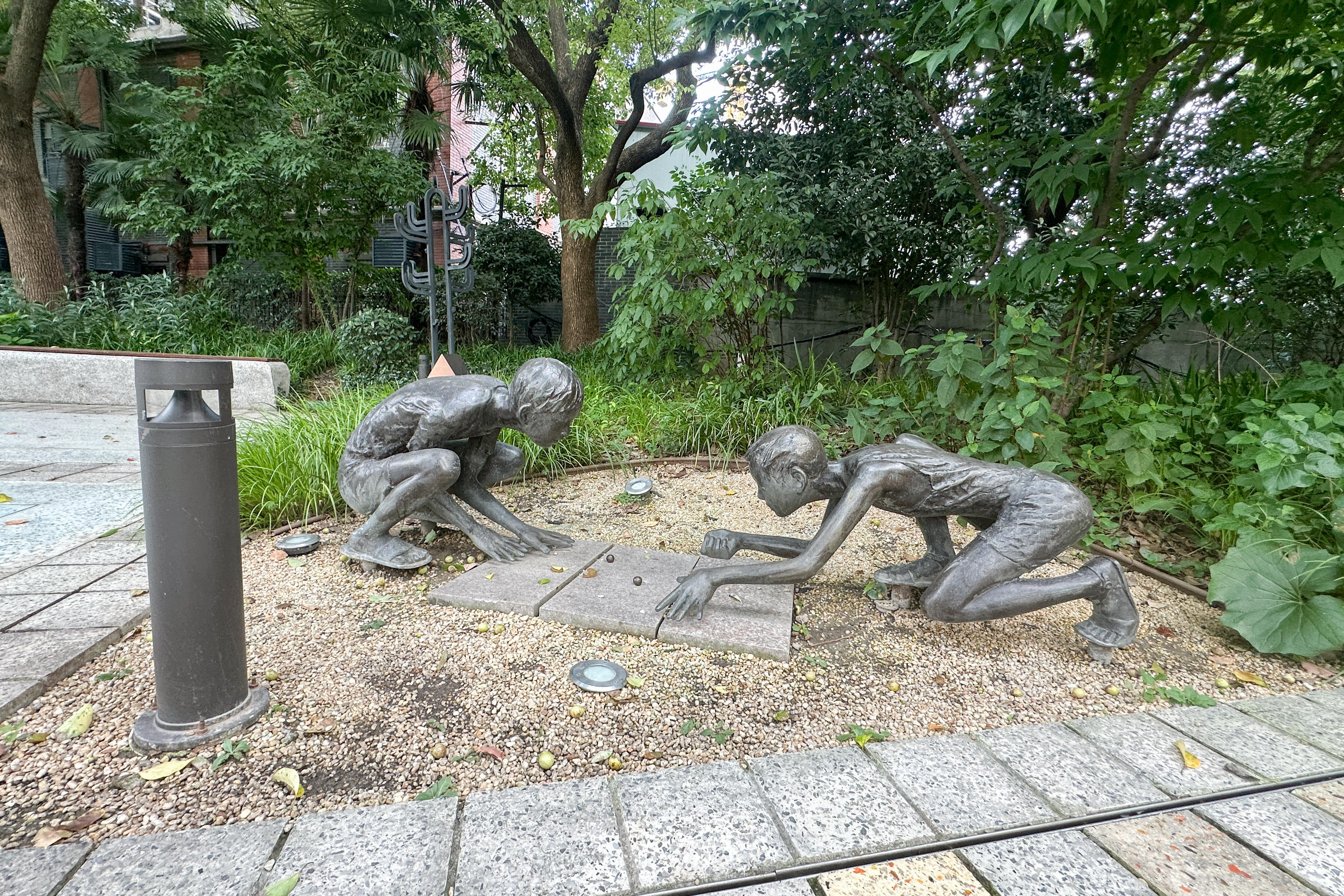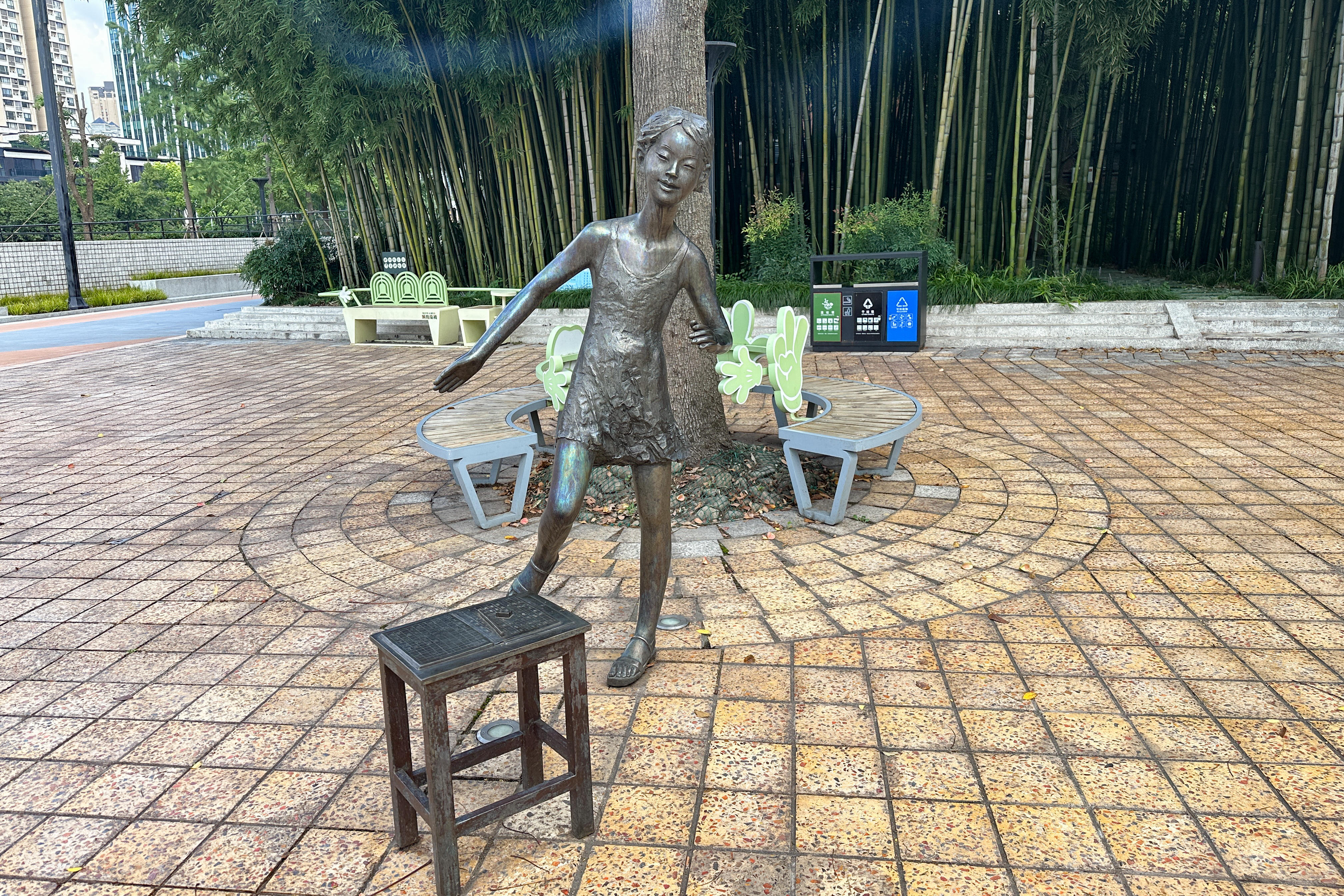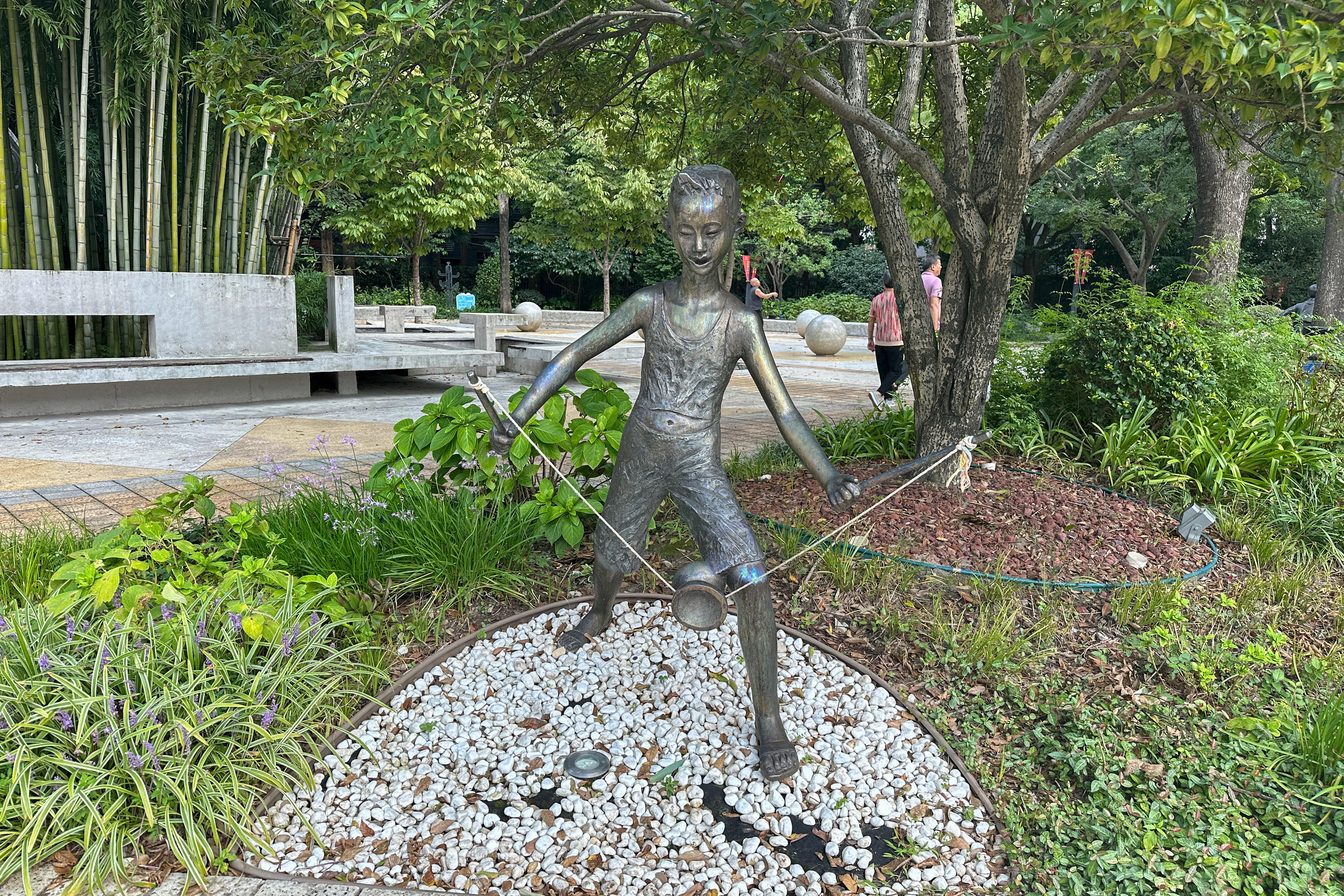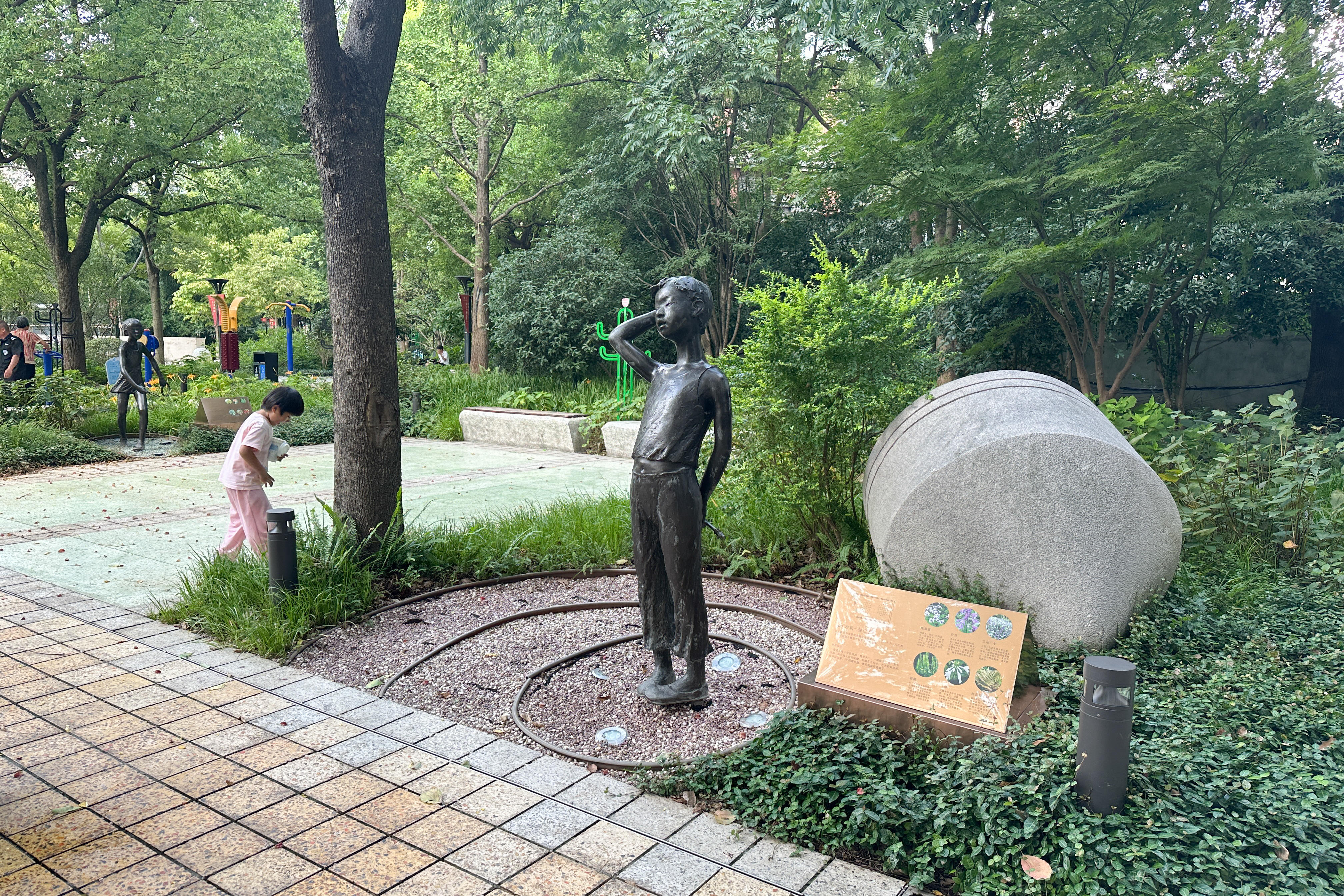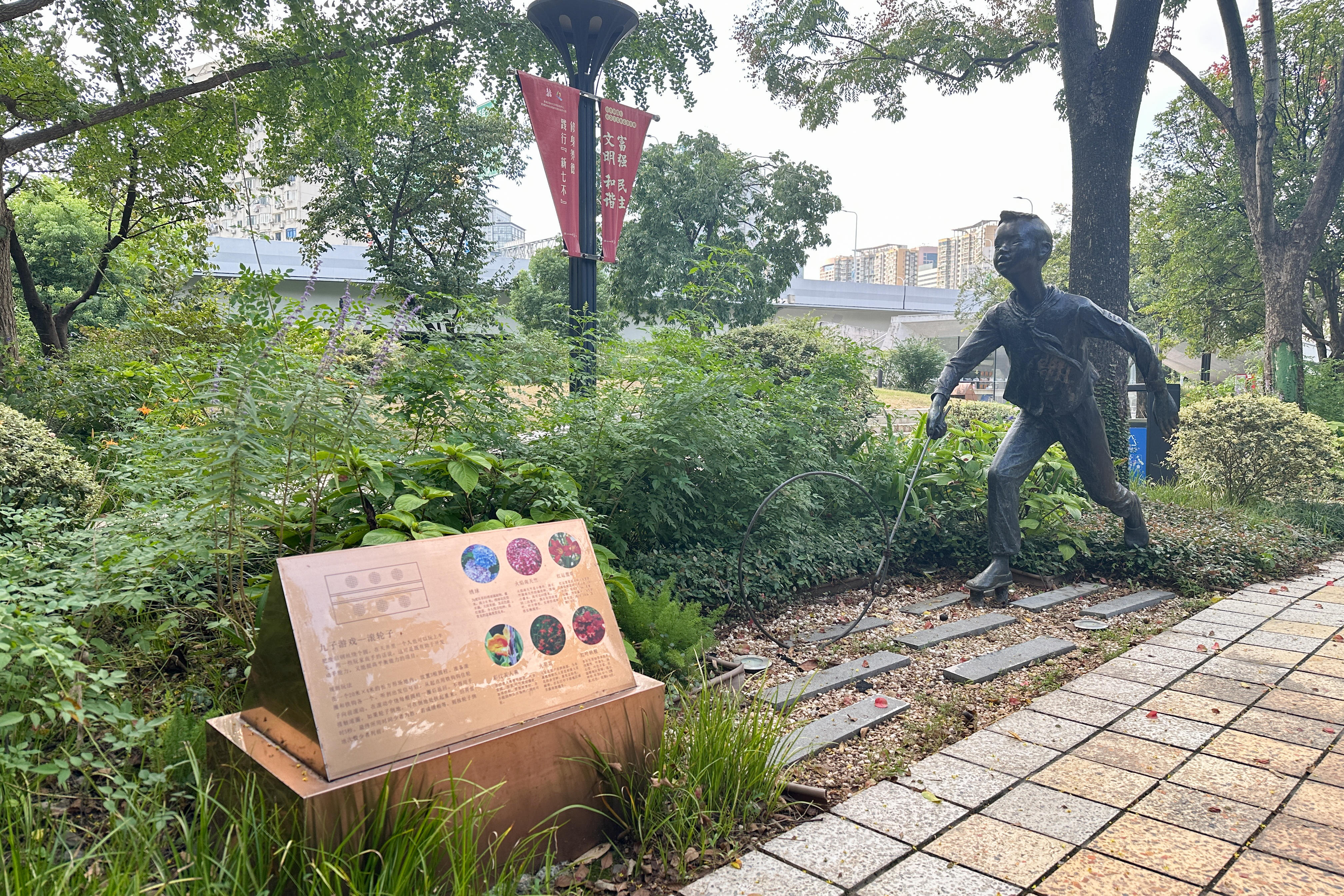 步入公园,一股浓厚的历史气息扑面而来。公园以老上海的 “九子游戏” 为主题,精心布置了各个游戏场景的雕塑和展示区。那些栩栩如生的雕塑,仿佛将人们带回到了旧时光里孩子们在弄堂中嬉戏玩耍的场景。