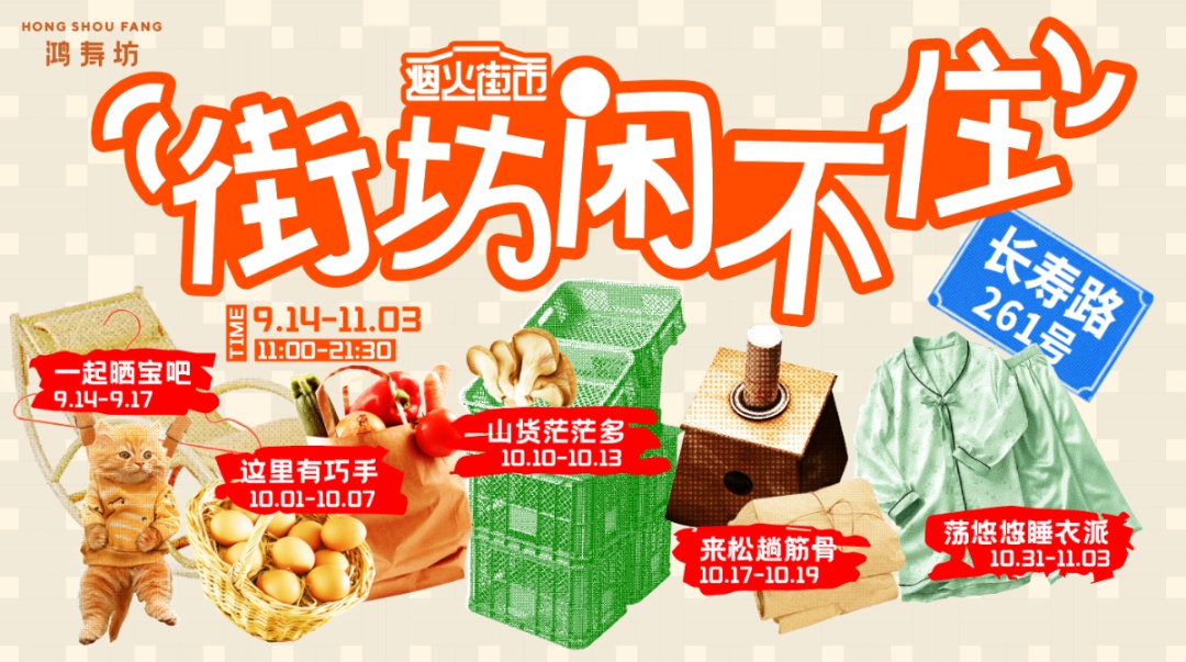 带着“万物皆可市集”的理念,五场不同主题的市集将轮番上新,贯穿9至11月。有以老弄堂的晾晒场景为灵感的“一起晒宝吧”市集,鼓励双手做工、展现能工巧匠风采的“这里有巧手”市集,收罗全国各地风味山货的“山货茫茫多”市集,将养生和潮流艺术融合的“来松趟经骨”市集,更有搞怪吸睛、潮流个性的“荡悠悠睡衣派”……糅合新世代青年文化和传统在地生活记忆,打造跨世代的全龄活力社区活动。值得一提的是,鸿寿坊还以社区居民熟悉的“居委会”为灵感,打造趣味市集服务点“街坊闲不住居委会”,居民和游客可以在这里领取打卡手册,完成指定任务兑换周年好礼。
