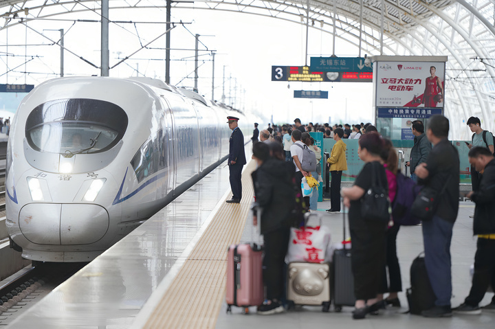 无锡东站客运工作人员加强乘降组织,引导旅客有序乘车出行。刘晓旦/摄