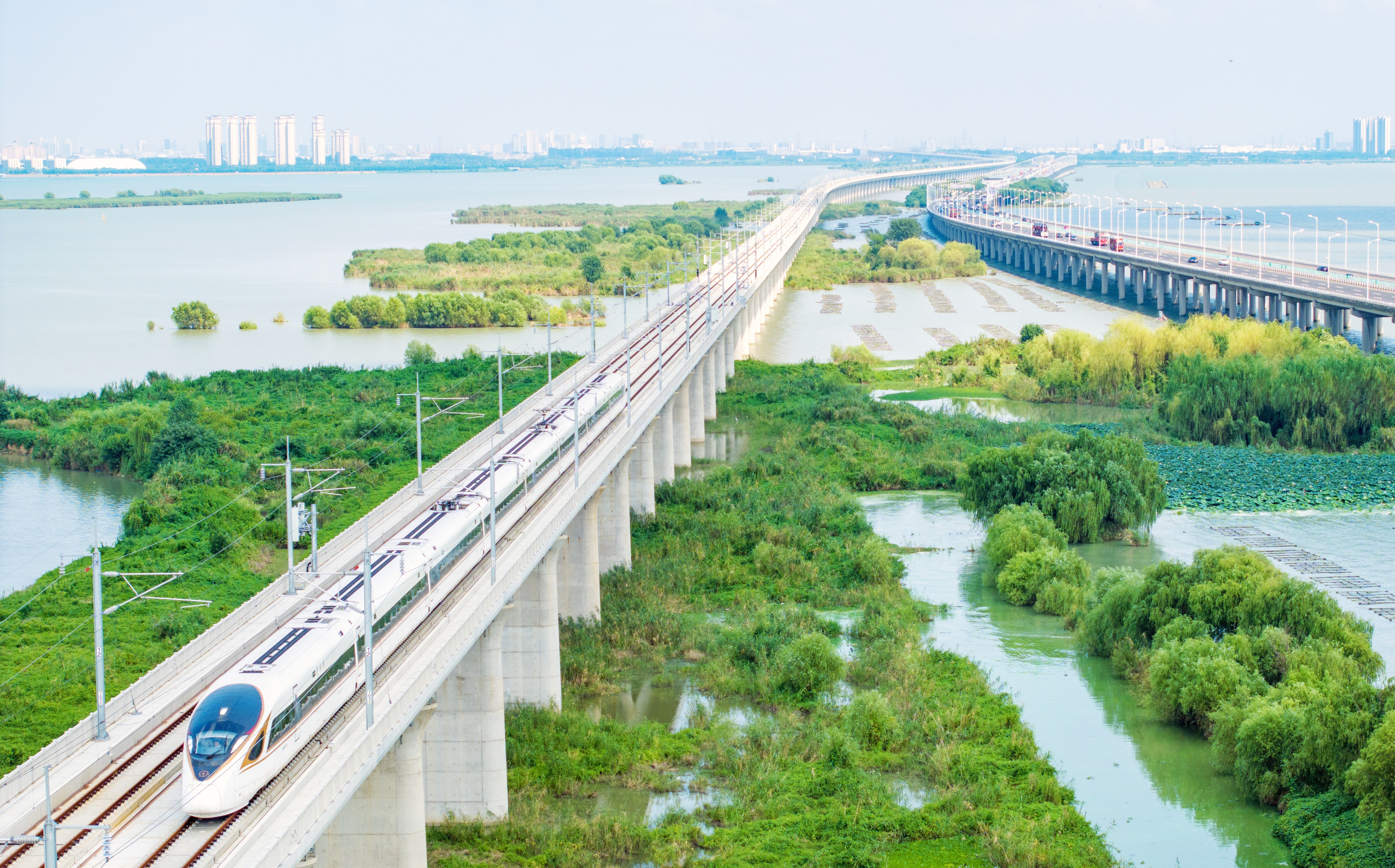 一列复兴号列车驶过沪宁沿江高铁常州特大桥滆湖段。徐晨/摄