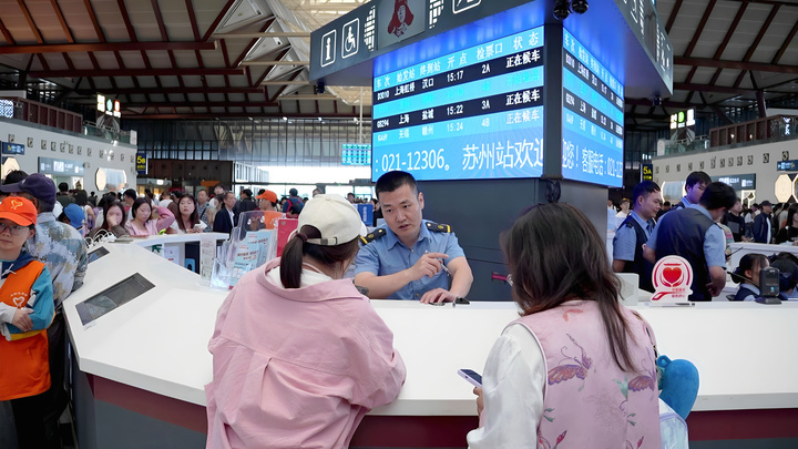 苏州站12306服务站工作人员为旅客提供问询解答服务。朱晨鑫/摄