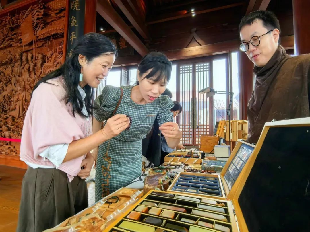 从传统名茶到创意茶饮、手工茶点,每个茶摊都有属于一个属于喜茶人的故事。摊主们身着古风服饰,温壶、置茶、高冲、洗茶、出汤、分茶,展示茶艺的魅力。茶摊除了茗茶茶具,现场还有篆刻文玩展示。