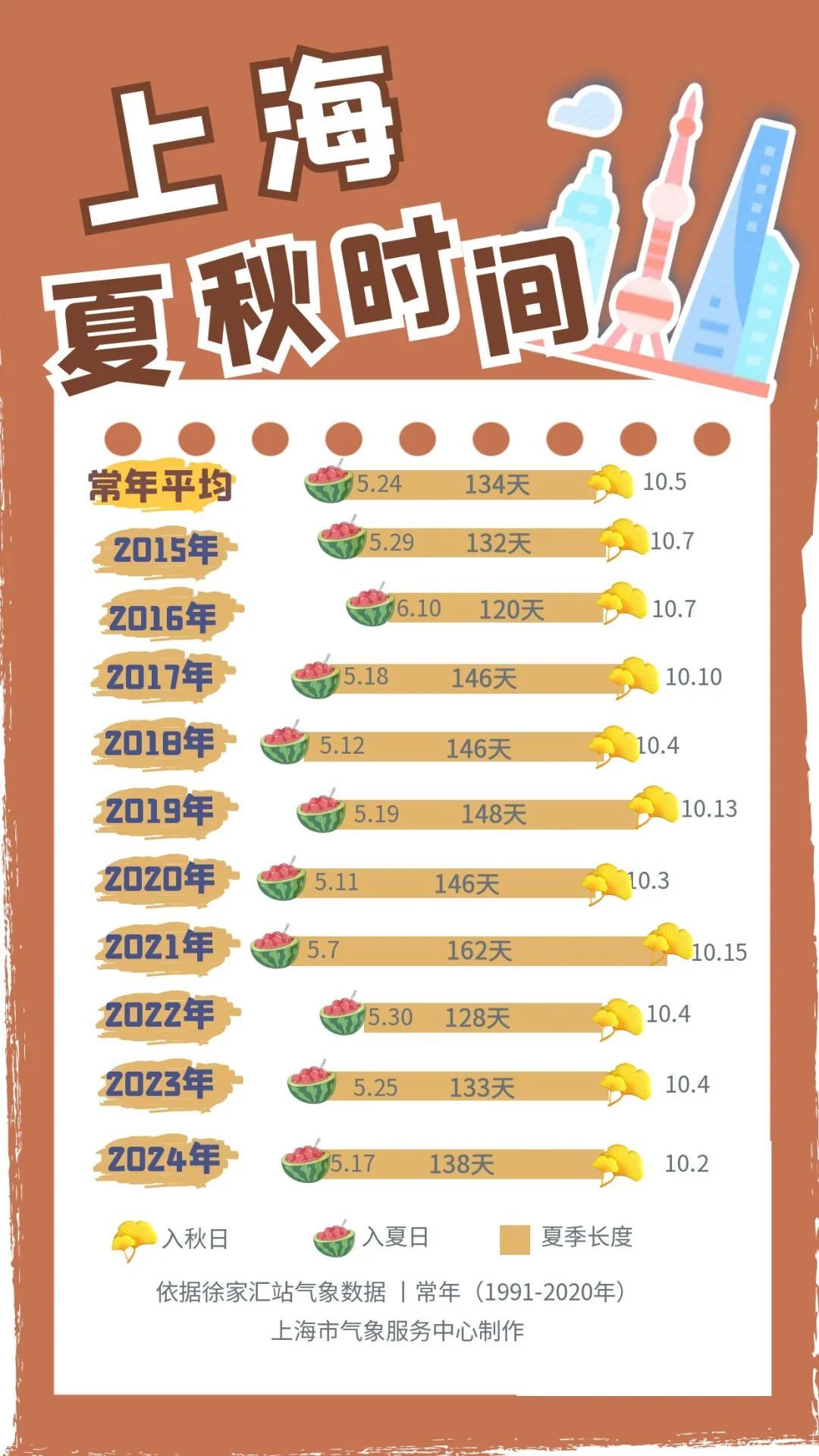 10月2日至今,已经连续5天日平均气温低于22℃,这也就是说上海气象意义上的秋天已经来到!10月2日即为今年的入秋日。上海常年(1991年—2020年)平均入秋时间是10月5日(徐家汇站),今年比常年提前了3天,是这十年来最早的秋天。同时今年长达138天的酷热夏天结束,比常年平均的夏季多出四天(常年平均134天)。