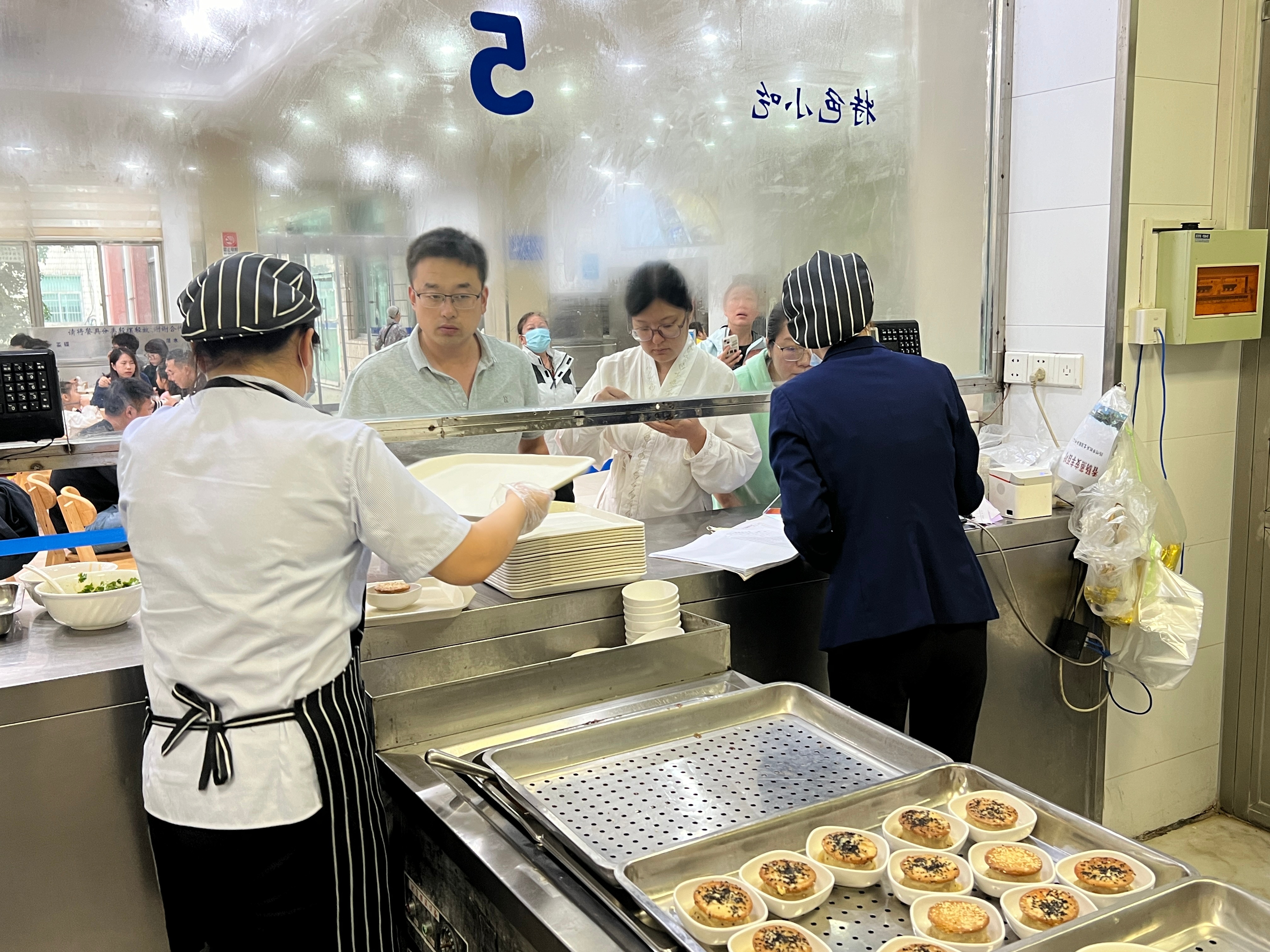 记者在现场看见,后厨里的几位大厨站在灶台前一手颠锅,一手掌勺,很快,梅干菜扣肉等菜品便新鲜出炉。紧接着,传菜师傅将一份份炒好的菜肴送去窗口,再由窗口工作人员按照游客的需求为其备餐。上一桌客人刚刚用餐完毕后,保洁人员立马将餐桌擦拭干净,等待下一桌客人的到来!