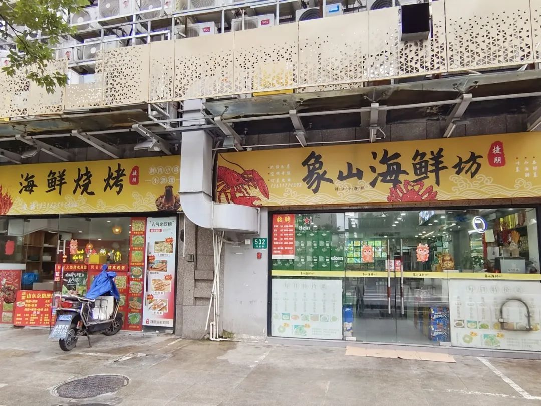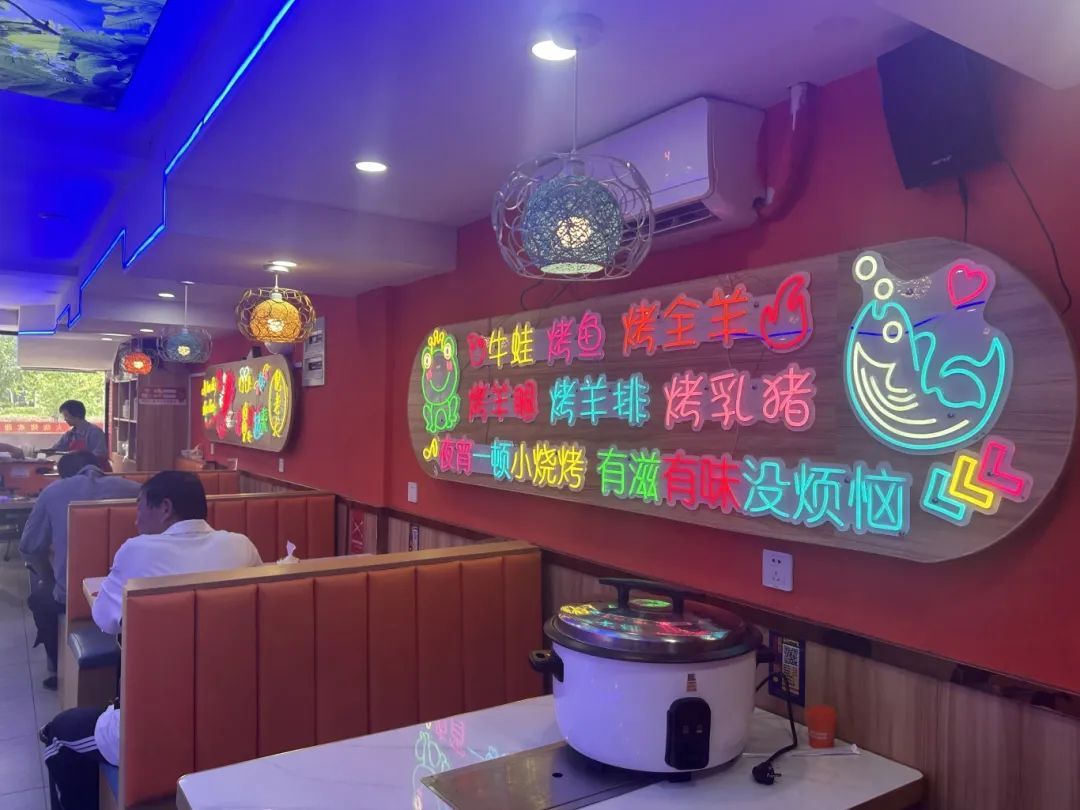 看到明黄色的“海鲜烧烤”招牌就找对了。餐馆老板在这条路上一口气租了四个门面,从午市快餐到深夜夜宵,承包你一天的美食生活。