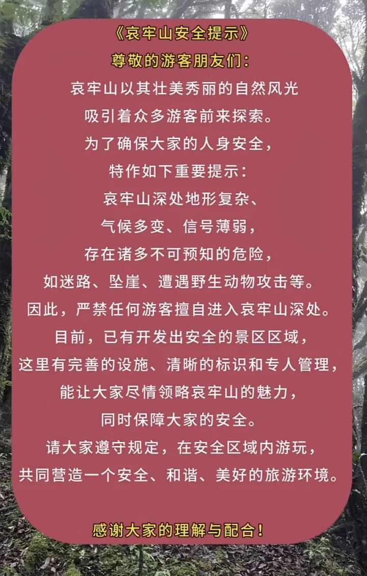 10月5日,@云南哀牢山仙境发布安全提示:哀牢山深处危险,别贸然前往未知地带,未开发区域不要深入。