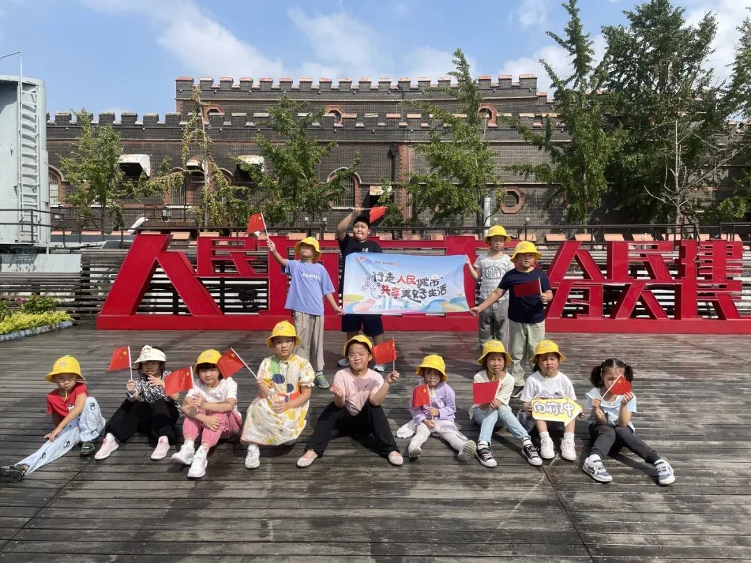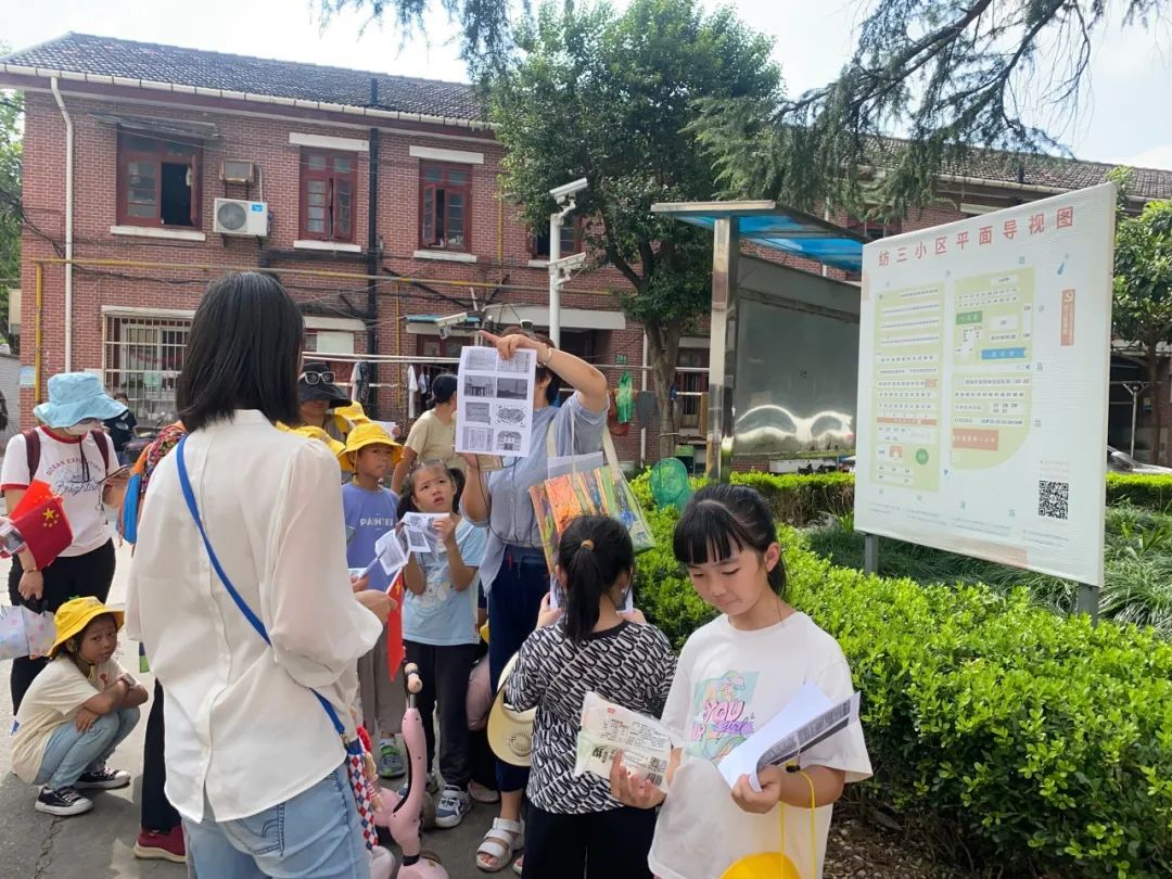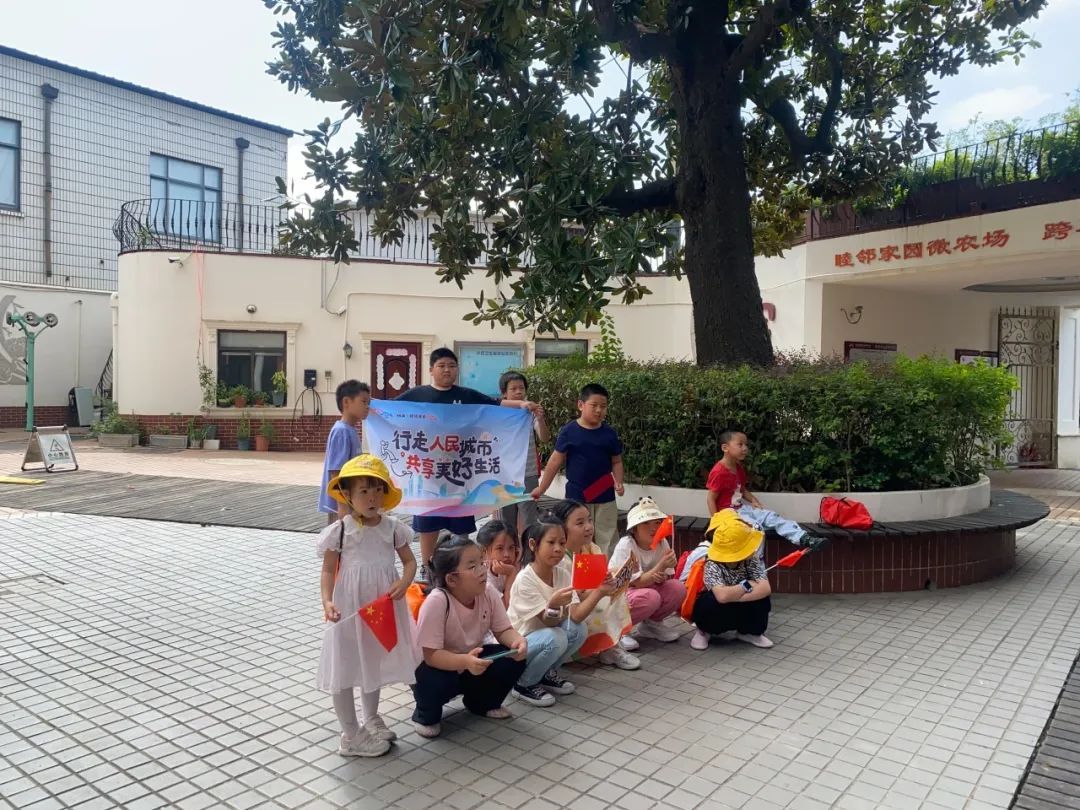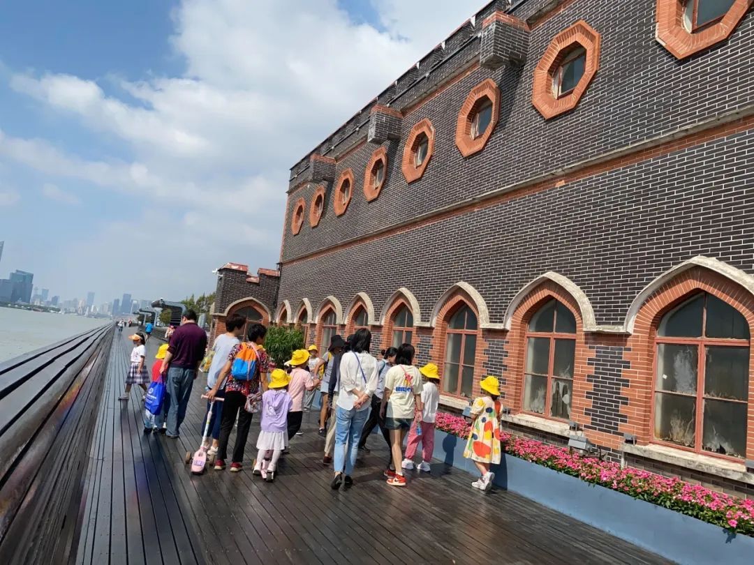 滨江沿岸的设计处处体现人文关怀细节。经过英商新怡和纱厂洋行大班住宅旧址就来到了水厂栈桥,临近国庆节,滨江沿岸被装饰的充满生机,爱心盆景和红红的五星红旗,远处隐约可见东方明珠矗立。随后大家来到有着百年历史的纺三小区,睦邻中心老师专门制作了小区特色建筑的小卡片让小朋友去寻找,大家对照实物做了比较,对这个设施一应俱全的百年历史小区有了深刻认识。