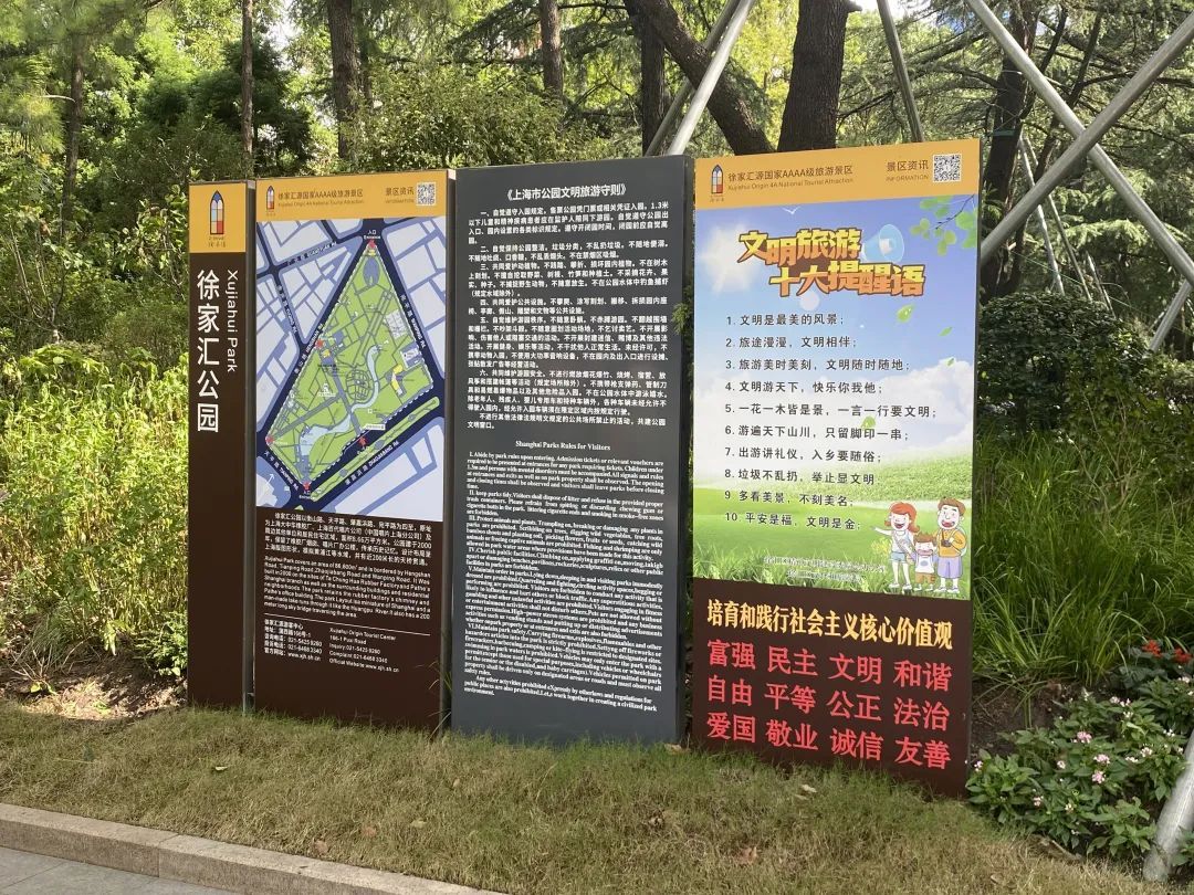 在徐家汇公园,醒目的文明旅游引导牌与公园景区介绍相得益彰,《上海市公园文明旅游守则》让游客和市民更清晰了解文明旅游的具体行为,各类文明旅游的提示标语在园区随处可见,营造出良好的文明旅游氛围。