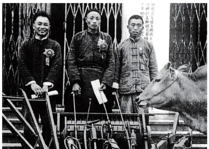 上海县诸翟乡顾小弟(中)出席市郊农业丰产评模大会,被评为丰产模范及模范互助组长