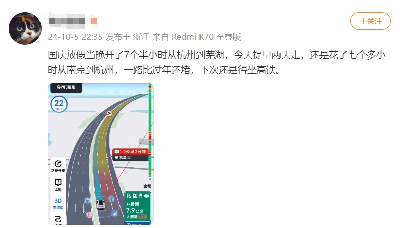 “沿路各种大堵车,尤其是江苏这边,但也不是完全不动的那种,就是慢慢挪,踩刹车都踩累了。”他说,最长的一处红色堵点有20公里。