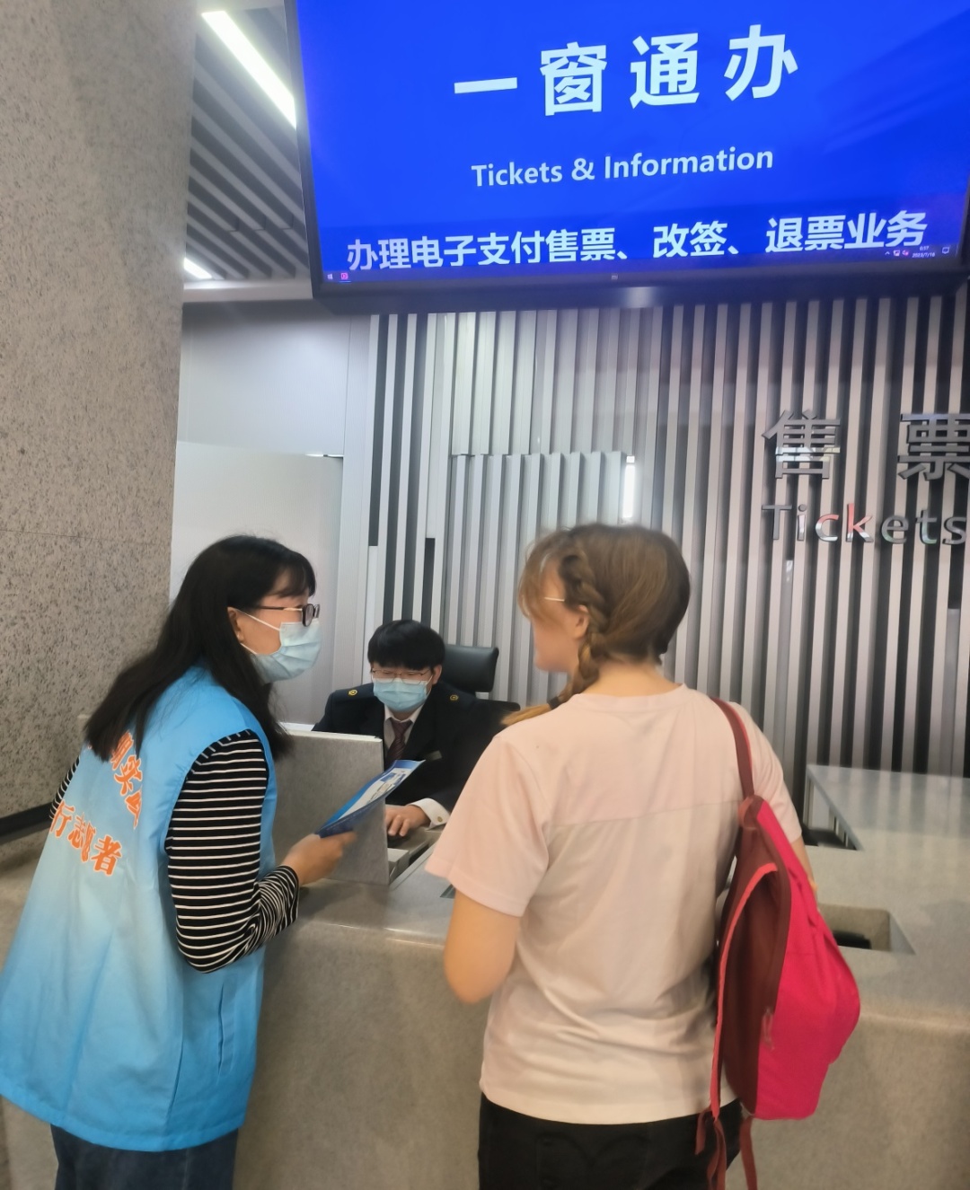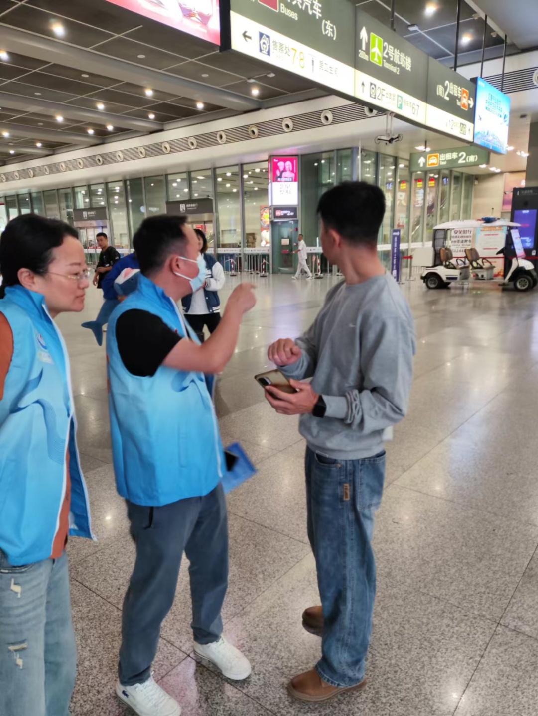 9月30日起,闵行区组织500名志愿者增援保障虹桥综合交通枢纽工作,为旅客提供现场咨询、指引服务,让旅客感受到上海城市的温度、闵行服务的精细度。 即日起,“今日闵行”推出“幸福闵行 志愿当先锋—国庆节志愿者手记”,一起来看—— 10月5日早晨,天空灰蒙蒙的,时不时飘落小雨。上午8时30分,来自区建设管理委的李凤莉、陈慧文、连冬旺3名同志身着天空蓝马甲,准时出现在虹桥枢纽到达层南2出站口的3号咨询点位,还没等放下装备,就被团团围住。 “请问去高铁站怎么走?”“前方直行,看到自动扶梯上二楼,那是出发层,高铁站就在那里。”连冬旺马上脱口而出地解答。原来,年初他已参与过一次春运期间虹桥火车站志愿活动,有着丰富的经验。 “你好,请问男厕所在哪里?”一个八九岁男孩清脆的声音在陈慧文耳边响起。 “小朋友,男厕所需要你从这里走到底,右手边转弯就能看到哦。”这时,陈慧文注意到男孩的父亲身上背着巨大的行李袋,左右手一个行李箱还有很多小包裹,行动已是非常的不方便,而厕所的距离也有几百米的往返,于是她主动提出让男孩的父亲等在咨询点位,由自己带着男孩去厕所。“太感谢了,帮了我大忙!”面对男孩父亲诚恳的谢意,陈慧文连连摆手,“能帮到你们,我们也非常高兴,祝旅途愉快,返程顺利”。 3号咨询点位临近地铁口,南北朝向出租车口,东朝2号航站楼,西向高铁火车出发层,东西方向还穿插着公共汽车站、长途汽车站和各个停车场,人员络绎不绝,咨询量非常大,两个小时后3名志愿者已是口干舌燥,嗓音嘶哑。为更好、更细致地做好服务工作,大家商量决定留存体力,与增派的一名志愿者两两组合轮休。 刚坐下,一位神情紧张的外国姑娘来到咨询台,“I can’t speak Chinese,if you can say a little English,can you help me? ”李凤莉立马起身,通过简单的交流,得知她想买一张10月10日到香港的高铁车票,而且要在人工柜台买。 李凤莉向她指明高铁站的方向,考虑到她不会说中文,自动扶梯又较远,与点位的老师商量后,李凤莉决定陪她一起前去出发层,带着她穿过自动扶梯,通过人工安检通道,帮助她与售票员沟通,最终买到了车票,听着外国姑娘连声的“Thank you”,李凤莉觉得这不仅仅是对志愿者的谢意,对闵行文明的肯定,更是对上海城市精神的赞赏。 提供充电宝方便旅客开机、打开自己的WIFI热点方便旅客查询信息、赠送口罩给需要的人群、护送儿童与家人顺利汇合、准确为旅客指明方向、提供咨询服务……这些小事都在点位上演,当日恰逢台风暴雨,区建设管理委的3名志愿者,用服务串起爱的纽带,做好每件小事温暖旅客的心,守候最后一班列车进站,坚守到第二天凌晨0时30分。
