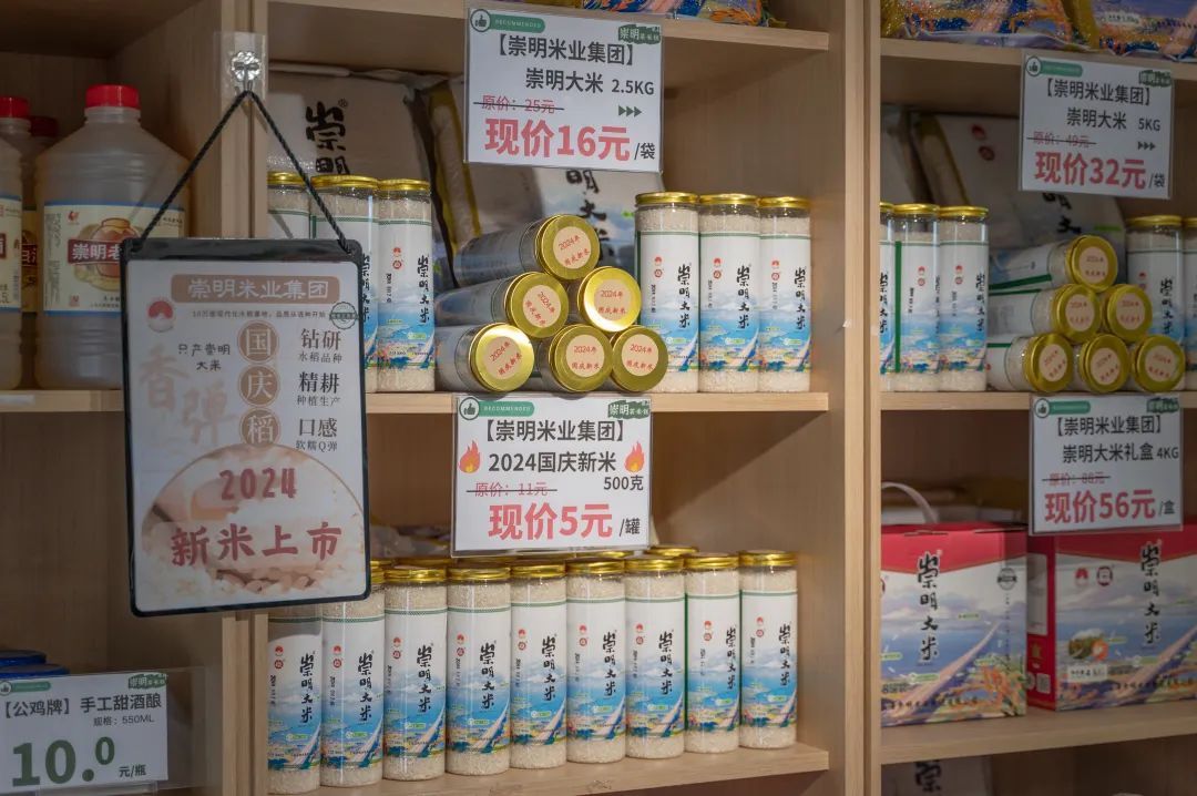 顾名思义,来自崇明的菜、米、糕便是这家直营店的三大主角。走进店内,首先映入眼帘的是各色蔬菜——崇明香酥芋、崇明金瓜、鲜毛豆……包装精致、新鲜水灵、价格亲民,是周边市民的“心头好”。布满整面墙的是崇明大米,以及米酒、酒酿等衍生产品。眼下,今年新收获的崇明大米已经上市。另一边的冰柜内,各色崇明传统糕点琳琅满目,吸引了不少市民前来挑选购买。