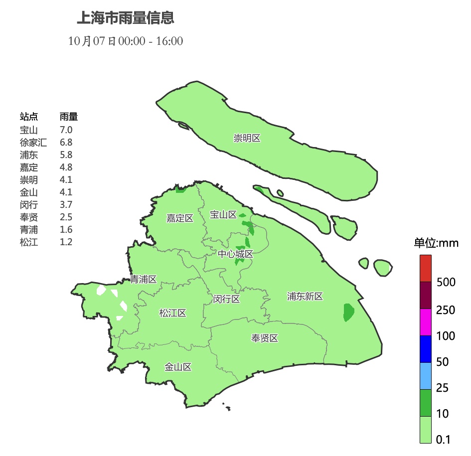 假期最后一天,上海乃至整个“包邮区”都是与阴雨天气相伴。上海雨水下下停停,普遍小雨,局部地区有中雨。气温低位徘徊,各区最高气温在20℃上下,以徐家汇站为例,白天最高气温20.0℃。