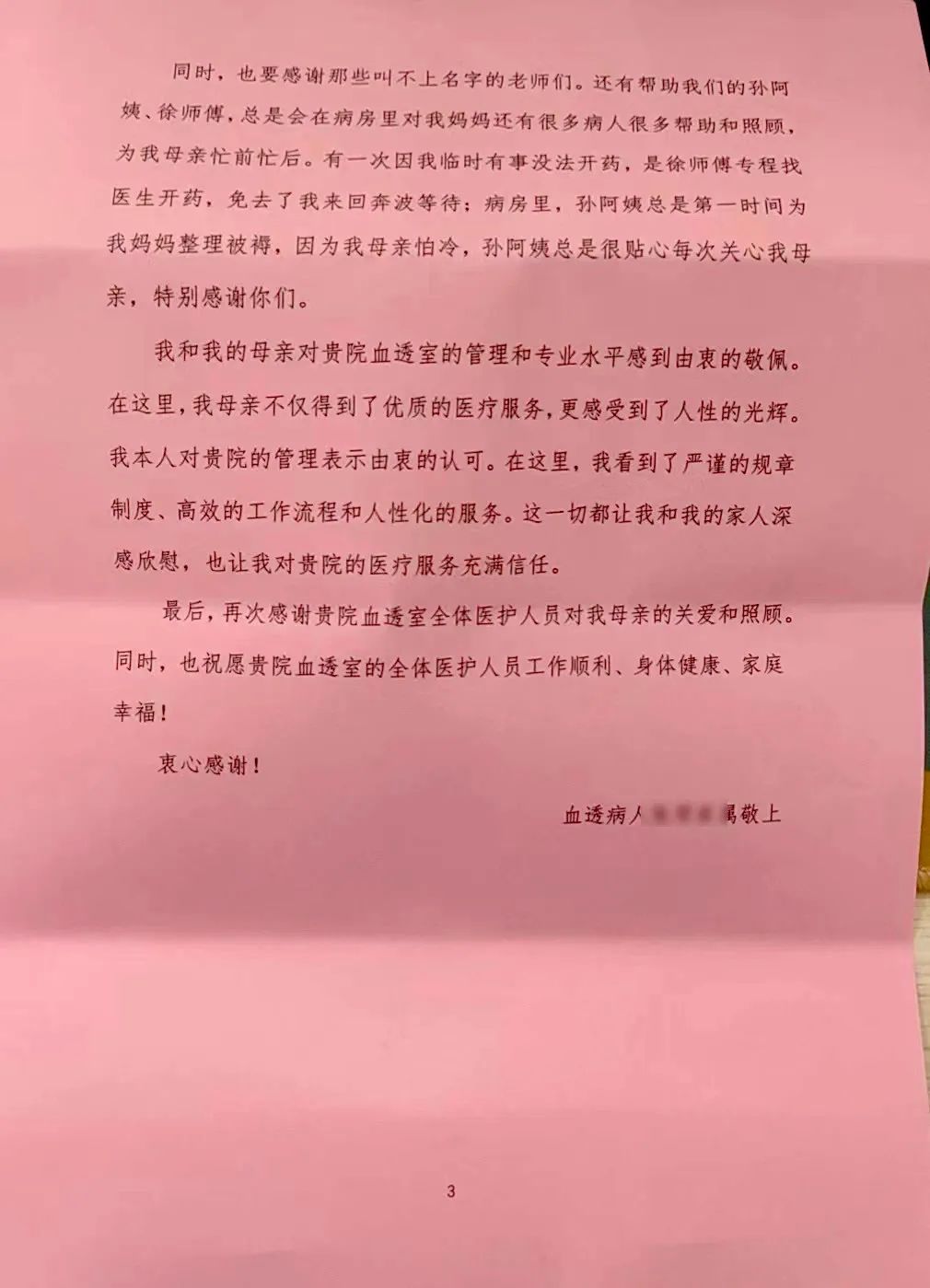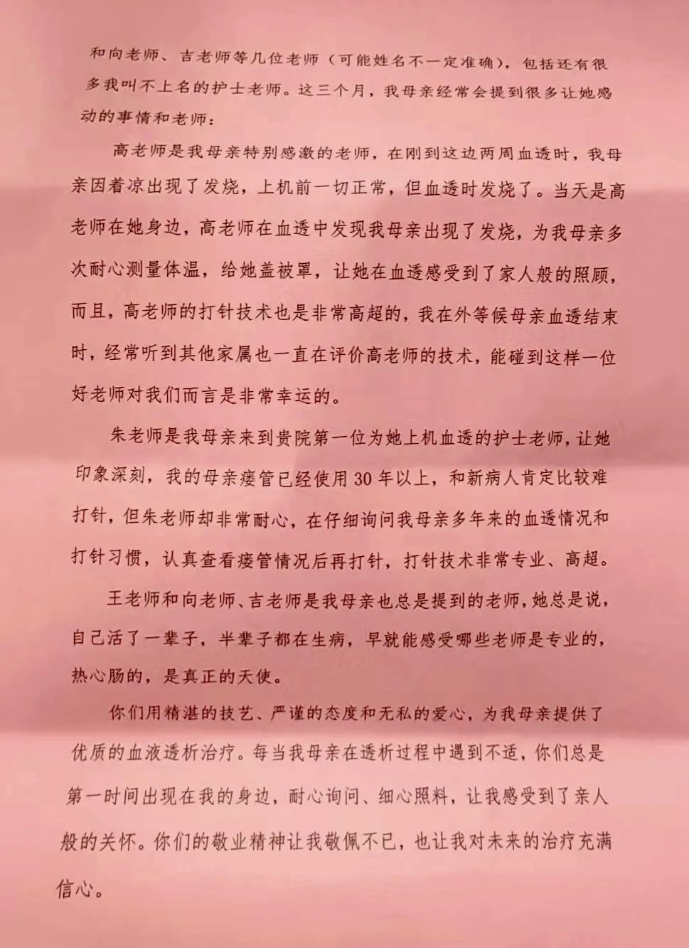 “我代表我的母亲衷心地感谢贵院血透室胡大勇主任、顾医生和护士高老师、朱老师、王老师、向老师、吉老师,以及那些我母亲和我未能一一记住名字的老师们,是你们让我母亲在30多年的血透生涯中,感受到另一个家的温暖和关爱……”