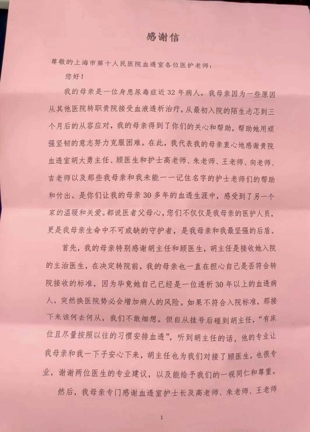 患者张女士家属写来的感谢信,像是上海市第十人民医院血透室医务人员“花名册”,熟稔程度仿佛家人,事实上她母亲来十院透析也仅5个月的时间……从转院时的陌生忐忑,到如今的安心从容,其家属将心路历程娓娓道来。